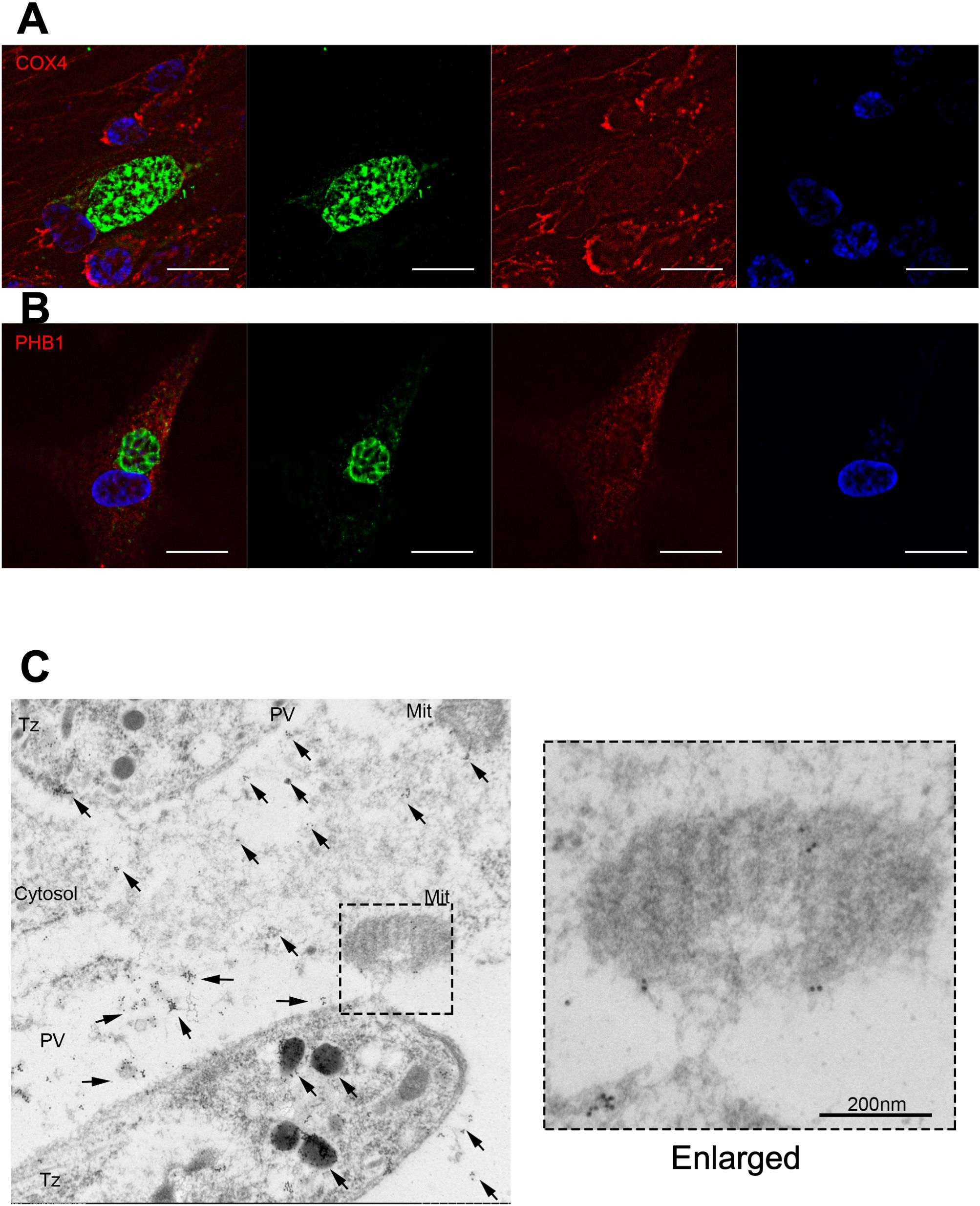 Figure 5. Indirect fluorescent antibody test of HFFs infected with the parental N. caninum strain Nc1. Indirect fluorescent antibody test of HFFs infected with the parental N. caninum strain Nc1 at 40 h postinfection using antibodies against CoxIV (A) and PHB1 (B). The parasites were stained with an anti-NcGRA7 antibody. Green: NcGRA7. Red: CoxIV and PHB1. Blue: nuclear staining with Hoechst 33342. Each experiment (biological replicate) was repeated two times. (C) Immunoelectron microscopic analysis of intracellular N. caninum (Nc1 strain). Gold-labeled NcGRA7 (arrows) is distributed not only in the dense granules of a parasite and in the parasitophorous vacuolar space but also in the host cytoplasm and the host mitochondria. In the high-magnification field, gold-labeled NcGRA7 was localized to the cristae and the outer membrane of the mitochondria and to an approximately 100 nm structure with moderate electron density. DG, dense granule; PV, parasitophorous vacuole; Cytosol, host cytosol; Mit, mitochondria; Tz, Tachyzoite. Each experiment (biological replicate) was repeated two times.