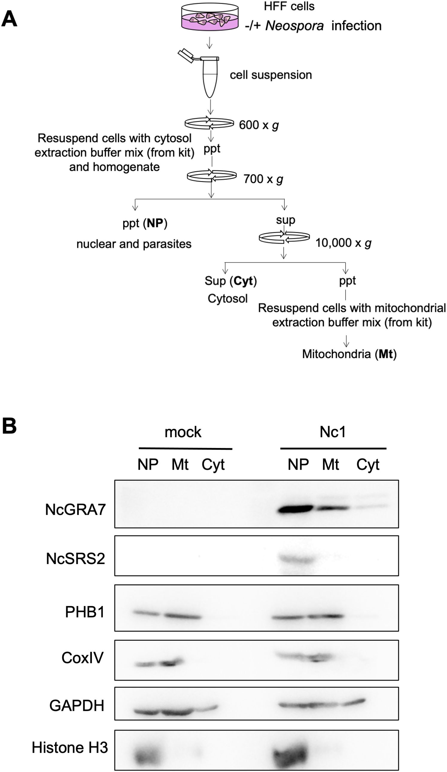 Figure 6. Western blot for the fractionation of cell homogenates. (A) Schematic view of the fractionation procedure used for the cell homogenates. HFFs infected with the parental Nc1 strain of N. caninum at 40 h postinfection and uninfected cells (mock) were homogenized, followed by sequential centrifugation to separate the nuclear/parasite (NP), mitochondrial (Mt) and cytosolic (Cyt) fractions. (B) Then, western blotting was performed using antibodies against NcGRA7, NcSRS2, PHB1, CoxIV, GAPDH, and Histone H3. M: molecular marker. Each experiment (similar biological replicate) was repeated three times.