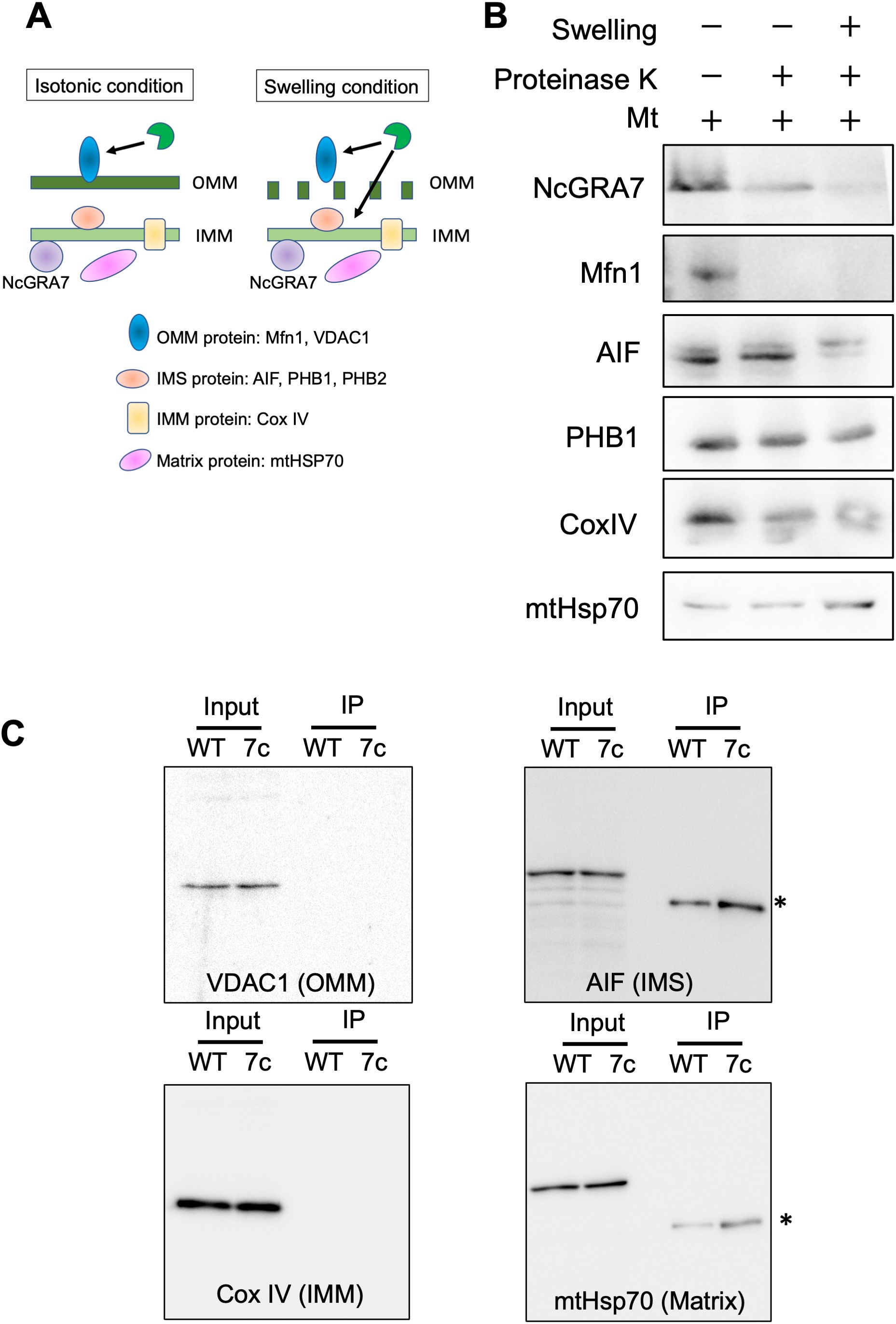 Figure 7. Localization of NcGRA7 in host mitochondria and binding to host mitochondrial proteins. (A) Schematic diagram of isolated mitochondria under isotonic and swelling conditions. Schematics of the isotonic (left) and swelling (right) conditions used in this study. Under isotonic conditions, proteinase K can access outer mitochondrial membrane (OMM) proteins but not the intermembrane space (IMS), inner mitochondrial membrane (IMM), or matrix proteins through membrane barriers. In addition, under swelling conditions, the protease can reach the IMS, followed by cleavage of both the OMM and IMS proteins. The inset shows mitochondrial proteins as markers for each category. (B) The mitochondrial fraction (Mt) isolated from HFFs was treated with proteinase K under isotonic (–) or hypotonic swelling (+) conditions. The reactants were developed by immunoblotting with antibodies against NcGRA7 or against several mitochondrial markers as indicated. OMM protein: Mfn1. IMS proteins: AIF, PHB1 and PHB2. IMM protein: COX IV. Matrix protein: mHsp70. Each experiment (biological replicate) was repeated two times. (C) Western blot of eluted fractions of HFFs infected with the parental strain Nc1 of N. caninum (WT) or NcGRA7-complemented parasites (7c) at 40 h post infection from anti-FLAG immunoprecipitation were analyzed by immunoblotting using antibodies against several mitochondrial markers as indicated. *Because mouse antibodies against FLAG, AIF and mHsp70 were used, the anti-mouse HRP secondary antibody was used to detect the anti-FLAG mouse antibody.