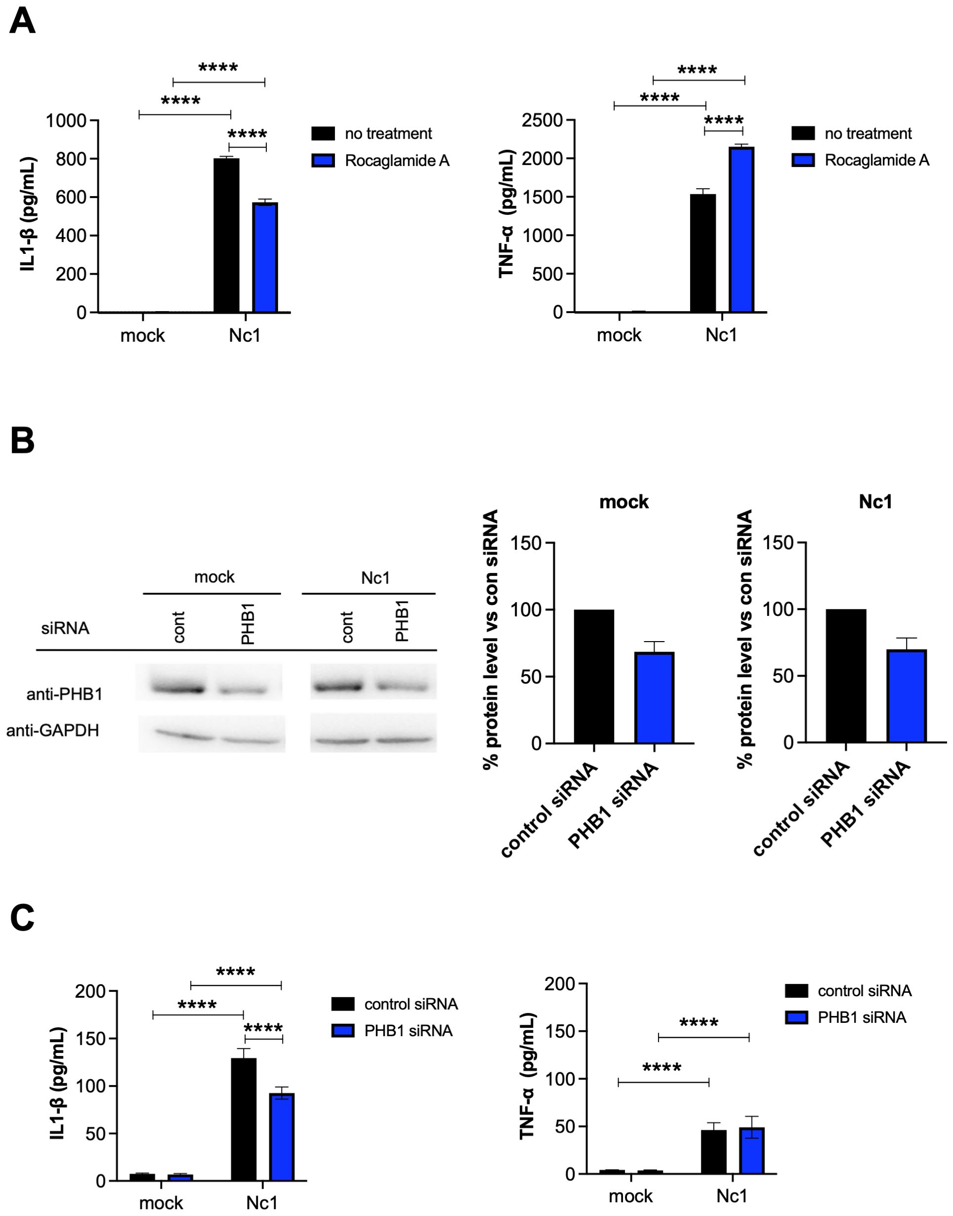 Figure 8. Effects of PHB1 on IL-1β and TNF-α production by THP-1 cells following N. caninum infection. (A) THP-1 cells were pretreated with 10 nM rocaglamide A (a PHB1 inhibitor), or medium only (no treatment) for 2 hr and then infected with the Nc1 strain of N. caninum at a multiplicity of infection (MOI) of 2.5 or treated with medium only (mock). At 20 h post infection, the IL-1β and TNF-α concentration in the culture supernatants was measured. Each value represents the mean ± SD of 4 replicates (technical replicates) in one representative experiment. Each experiment (biological replicate) was repeated five times. *statistically significant differences according to two-way ANOVA and a Tukey–Kramer post hoc analysis (P < 0.05). (B) THP-1 cells were transfected with control siRNA (cont), or PHB1 siRNA for 20 hr and then infected with the Nc1 strain of N. caninum at a MOI of 2.5 or treated with medium only (mock). At 20 h postinfection, the culture supernatants and cells were collected for cytokine ELISA and western blotting, respectively. The protein levels of PHB1 in the cell lysates were analyzed via western blotting. The protein levels were quantified based on band intensity. The protein levels of PHB1 were normalized to the protein levels of GAPDH, and then the reduction of PHB1 protein levels by PHB1 siRNA were calculated by relative to the control siRNA in the mock or the parasite infection. Each value of % protein level represents the mean ± SEM of three independent experiments (biological replicates). (C) At 20 h postinfection, the IL-1β and TNF-α concentration in the culture supernatants from (B) was measured. Each value represents the mean ± SD of 4 replicates (technical replicates) in one representative experiment. Each experiment (biological replicate) was repeated three times. Statistically significant differences according to one-way ANOVA or two-way ANOVA and a Tukey–Kramer post hoc analysis (**** P < 0.0001).