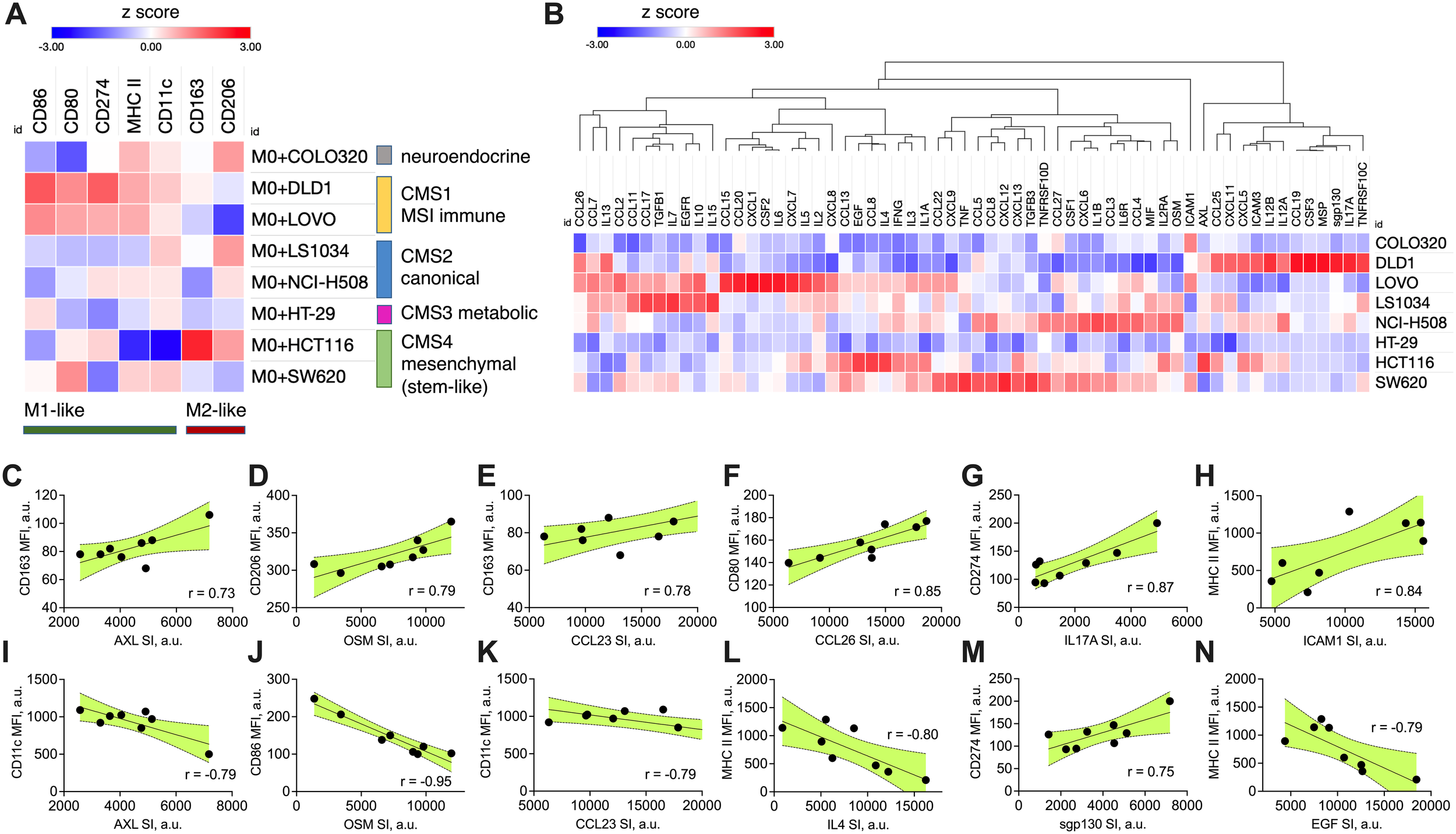 CRC-induced macrophage polarization and its association with specific cytokine production signatures. (A) Heatmap showing the marker expression on M0 macrophages after 48-hour transwell co-culture with CRC cell lines of different molecular subtype (CMS 1-4). Macrophage polarization was assessed by flow cytometry using specific M1 (CD86, CD80, CD274, MHC II, CD11c) and M2 (CD163, CD206) markers. Data are presented as modified z-scores of MFI, with red indicating high expression and blue indicating low expression. (B) Hierarchical clustering heatmap of cytokine and chemokine production profiles from CRC cell lines, quantified using semi-quantitative membrane-based cytokine array. The relative protein expression in cell lysates is shown as modified z-scores, with red indicating high expression and blue indicating low expression. (C–N) Correlation plots showing cancer cell cytokine production (X axis, SI values) against macrophage marker expression (Y axis, MFI values). Pearson correlation coefficients (r) are displayed in each plot, with shaded areas representing the 95% confidence interval. All shown correlations were statistically significant (two-sided p < 0.05, Pearson correlation test), indicating strong positive or negative associations between specific cytokines and macrophage polarization markers. MFI – median fluorescence intensity, CMS – consensus molecular subtype, SI – signal intensity, a.u. – arbitraty units.