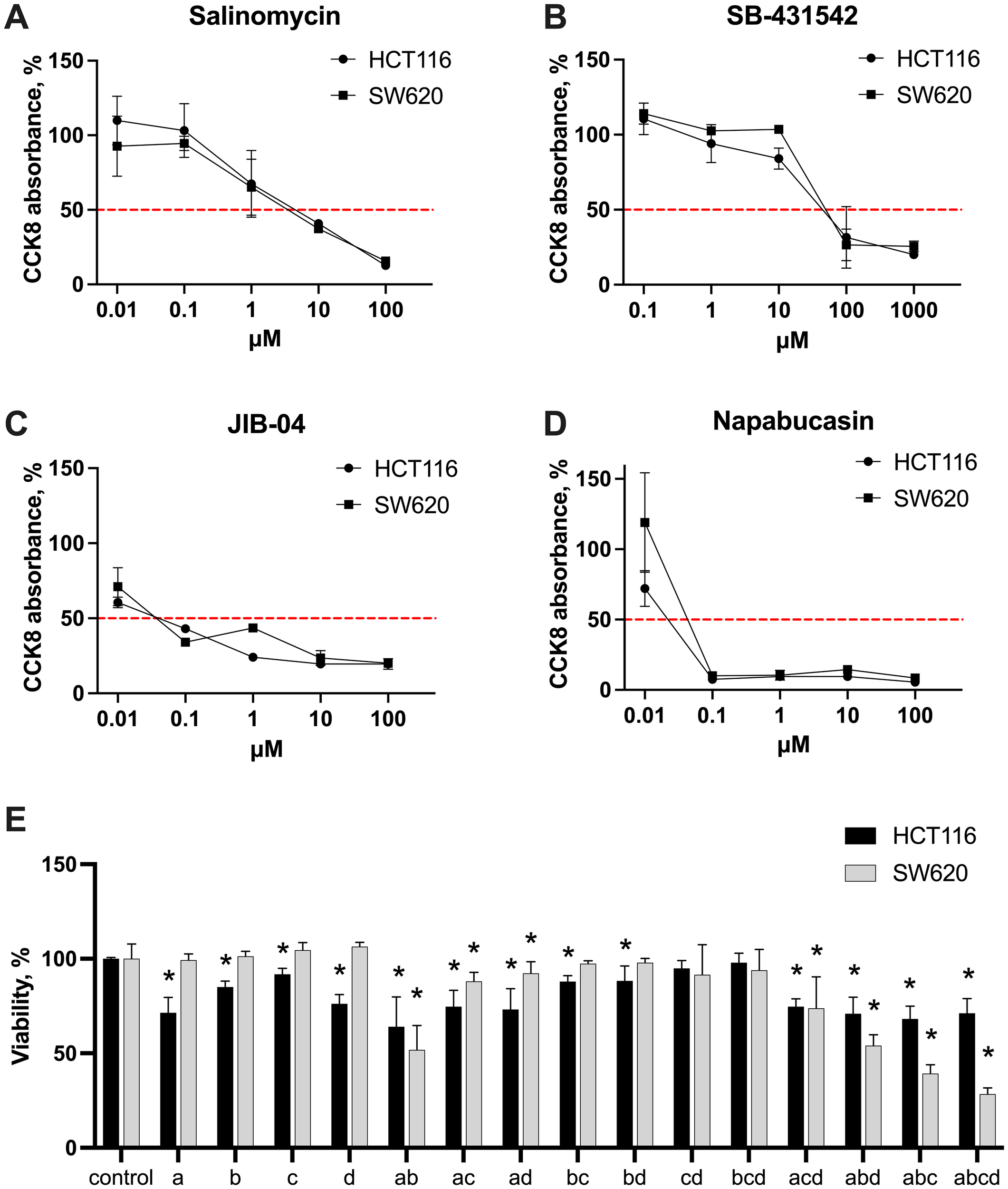 To evaluate the cytotoxicity of stemness inhibitors in vitro, we used CCK-8 assay (Dojindo, cat. no. CK04-11). This assay measures cell viability by detecting the reduction of a tetrazolium salt by cellular dehydrogenases into a soluble orange formazan product, which is directly proportional to the number of metabolically active cells. CRC cells were seeded in 96-well plates at a density of 1×10^4 cells per 100 μL of RPMI medium. The plates were incubated for 24 hours at 37°C in a 5% CO2 atmosphere. Following incubation, 100 µL of varying concentrations of the tested inhibitors in RPMI medium were added to the wells: salinomycin (0.01, 0.1, 1, 10, 100 μM), SB-431542 (0.1, 1, 10, 100, 1000 μM), napabucasin (0.01, 0.1, 1, 10, 100 μM), and JIB-04 (0.01, 0.1, 1, 10, 100 μM). The cells were exposed to the drugs and cultured for 48 hours. After this, 200 µL of CCK-8 reagent mixed with RPMI medium was added to each well, followed by a 1-hour incubation. RPMI medium without cells was used as the control. CCK-8 absorbance was measured at 450 nm using a Biotek ELx800 microplate reader. The obtained data were analyzed using Gen5 software and Microsoft Excel. The inhibitory concentrations of the compounds that inhibited 50% of cell metabolic activity (IC50 values) were calculated from dose-response curves.