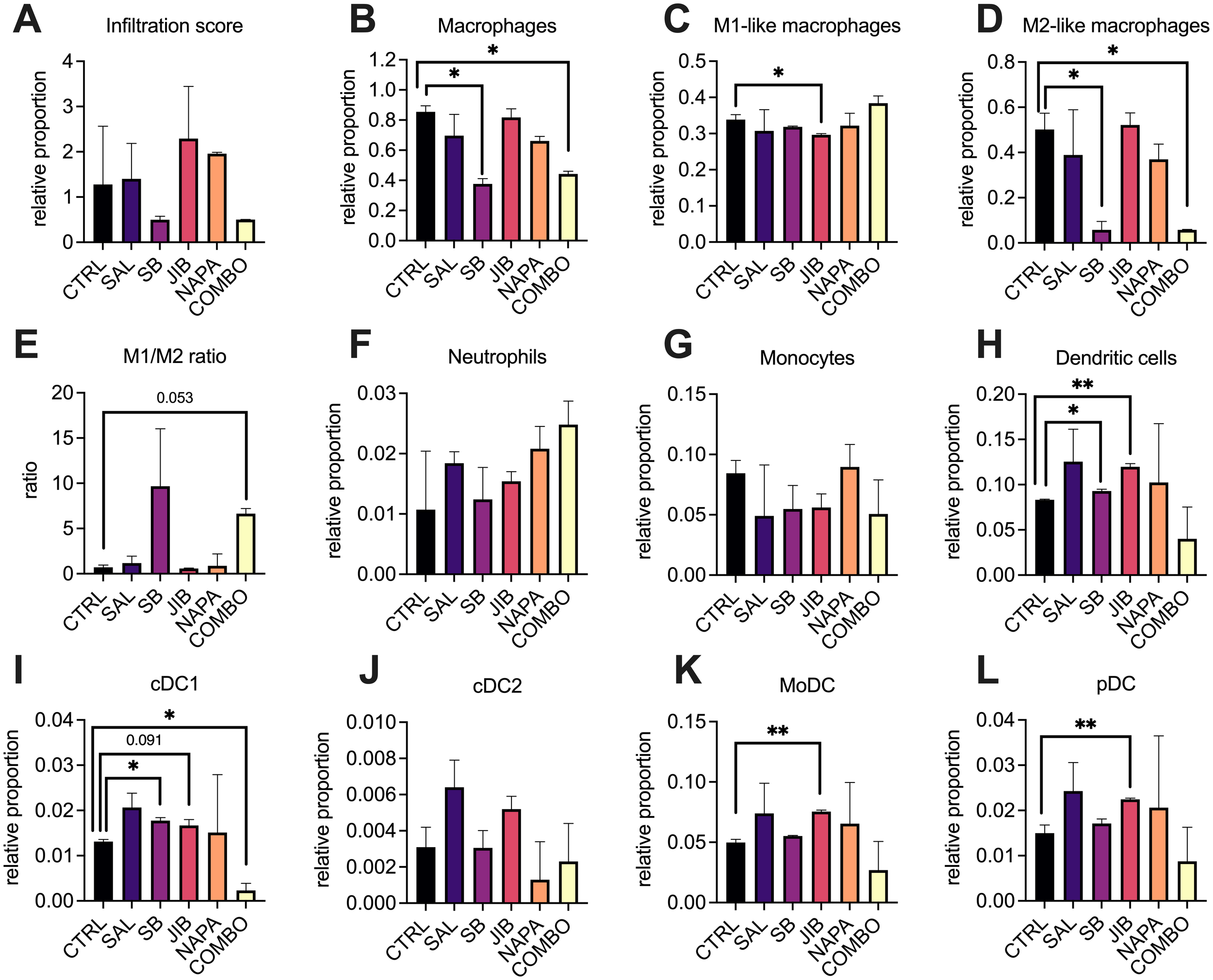To analyze the relative proportions of myeloid immune cell populations within the tumor microenvironment, we performed immune cell deconvolution using ImmuCellAI-mouse (30). This tool employs a gene signature-based hierarchical three-layers approach to estimate the infiltration levels of 36 immune cell subtypes, including various myeloid populations such as macrophages, dendritic cells (DCs), and neutrophils. For the deconvolution analysis, genes with low expression (TPM <1) were excluded to reduce noise. TPM values were uploaded to the online platform (31) and after processing, we obtained estimated infiltration scores for different immune cell types across all experimental groups. The results were analyzed to compare immune cell fractions between treatment groups and control, focusing on shifts in macrophage polarization and other myeloid populations.