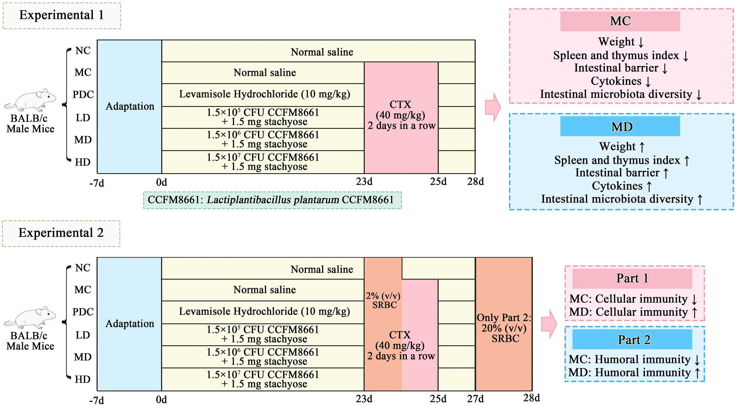 Mice were divided into the normal control group, model control group (normal saline), positive drug control group (levamisole hydrochloride, 10 mg/kg), and low, medium, and high-dose groups (1.5×105, 1.5×106, and 1.5×107 CFU of Lactiplantibacillus plantarum CCFM8661 + 1.5 mg stachyose). Each treatment group received continuous oral gavage administration for 28 days. On days 23 and 24, except for the normal control group, all other groups were intraperitoneally injected with cyclophosphamide (40 mg/kg) to establish an immunosuppressed model. On day 28, 30 minutes after the final administration, the mice were euthanized to collect the thymus, spleen, serum, ileum, and feces for subsequent analysis of immune indicators, intestinal barrier function, serum cytokines, and intestinal microbiota.