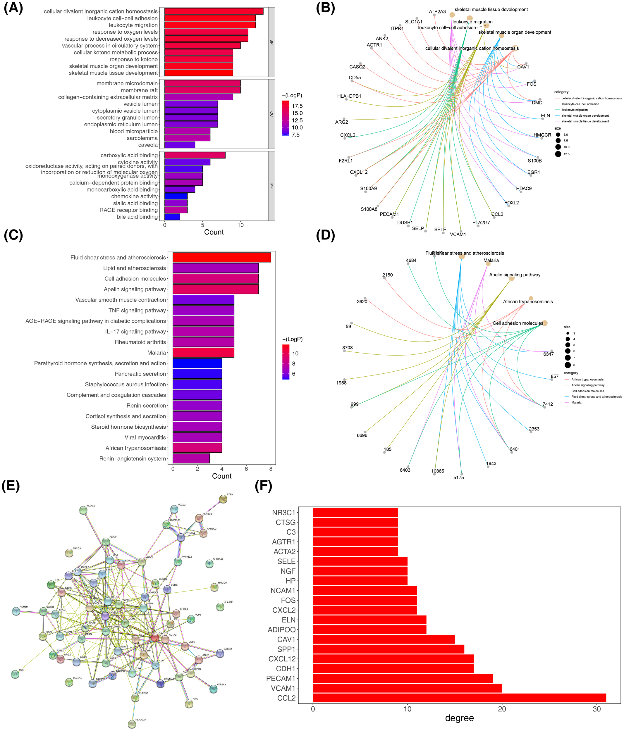 Function enrichment analysis and protein-protein interaction (PPI) network. (A, B) Gene Ontology (GO) of DE-OSRGs. (C, D) Kyoto Encyclopedia of Genes and Genomes (KEGG) of DE-OSRGs. (E) PPI network of DE-OSRGs. (F) The top 20 genes with the highest connectivity.