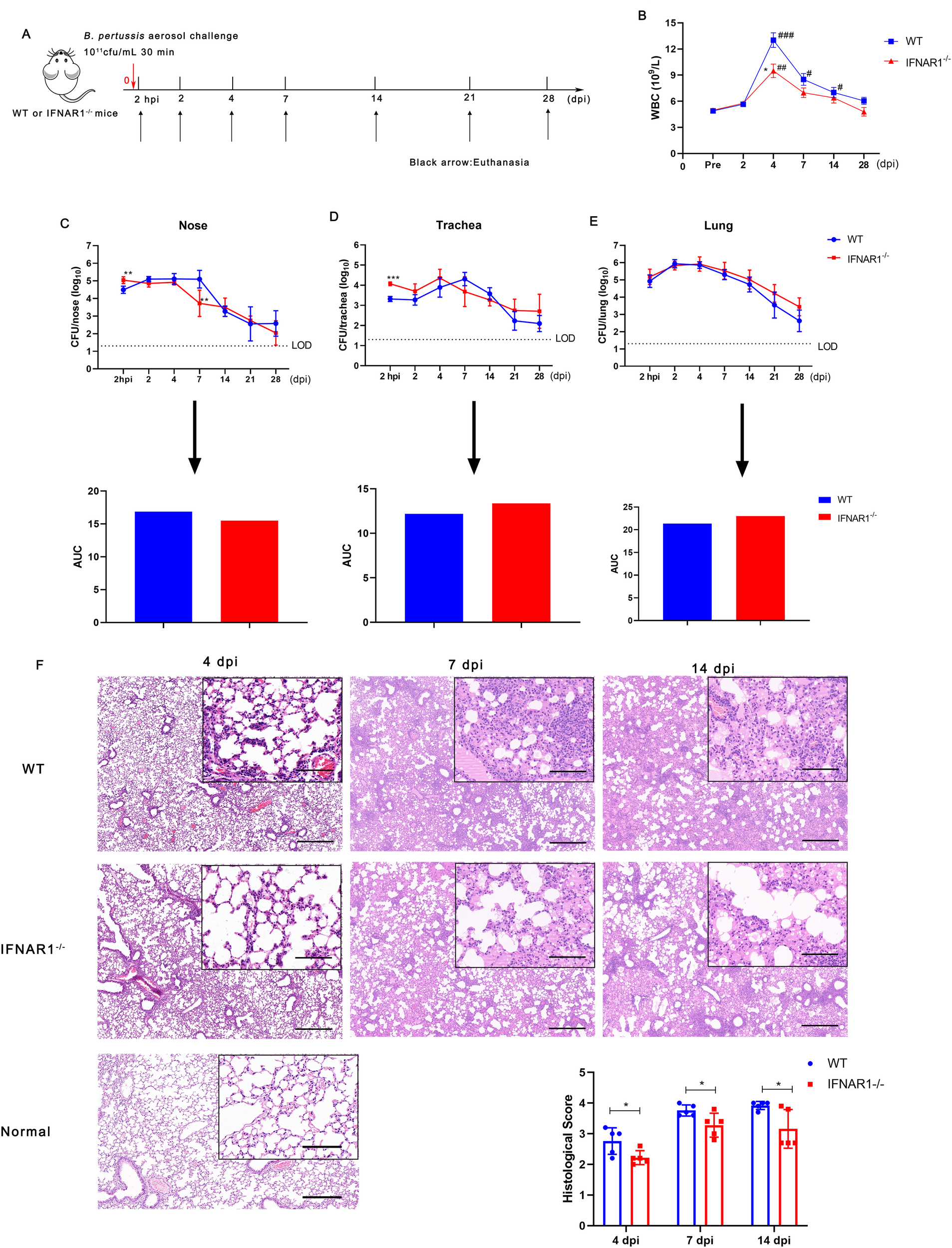 Leucocyte count, bacterial colonization, and lung histological changes in WT and IFNAR1-/- mice after infection with B. pertussis. (A) Timeline of B. pertussis aerosol challenge and sample collection from WT and IFNAR1-/- mice. (B) Dynamic profiles of the number of WBCs per μL of peripheral blood in B. pertussis-infected animals. (C) CFU counts in nasal homogenates and corresponding areas under the bacterial clearance curves (AUCs). (D) CFU counts in tracheal homogenates and corresponding AUCs. (E) CFU counts in the lung homogenates and corresponding AUCs. (F) Representative images of H&E-stained lung tissues from 4, 7, and 11 dpi. Scale bar, 50 μm. The results are presented as the means ± SEM (n = 5). The dashed line represents the lower limit of detection (LOD). The P value is indicated as follows: *P < 0.05, ** P < 0.01, *** P < 0.001 vs. WT mice; # P < 0.05, ## P < 0.01, ### P < 0.001 vs. prior to infection in the WT and IFNAR1-/- groups.