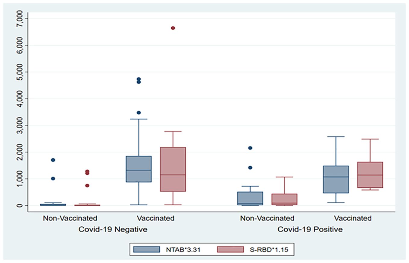 Mothers who received more vaccination doses against COVID-19 had higher values of both antibodies (NTAb*3.31 and S-RBD*1.15) in the serum of their offspring, as shown in the box plots in Figures 4 and 5.