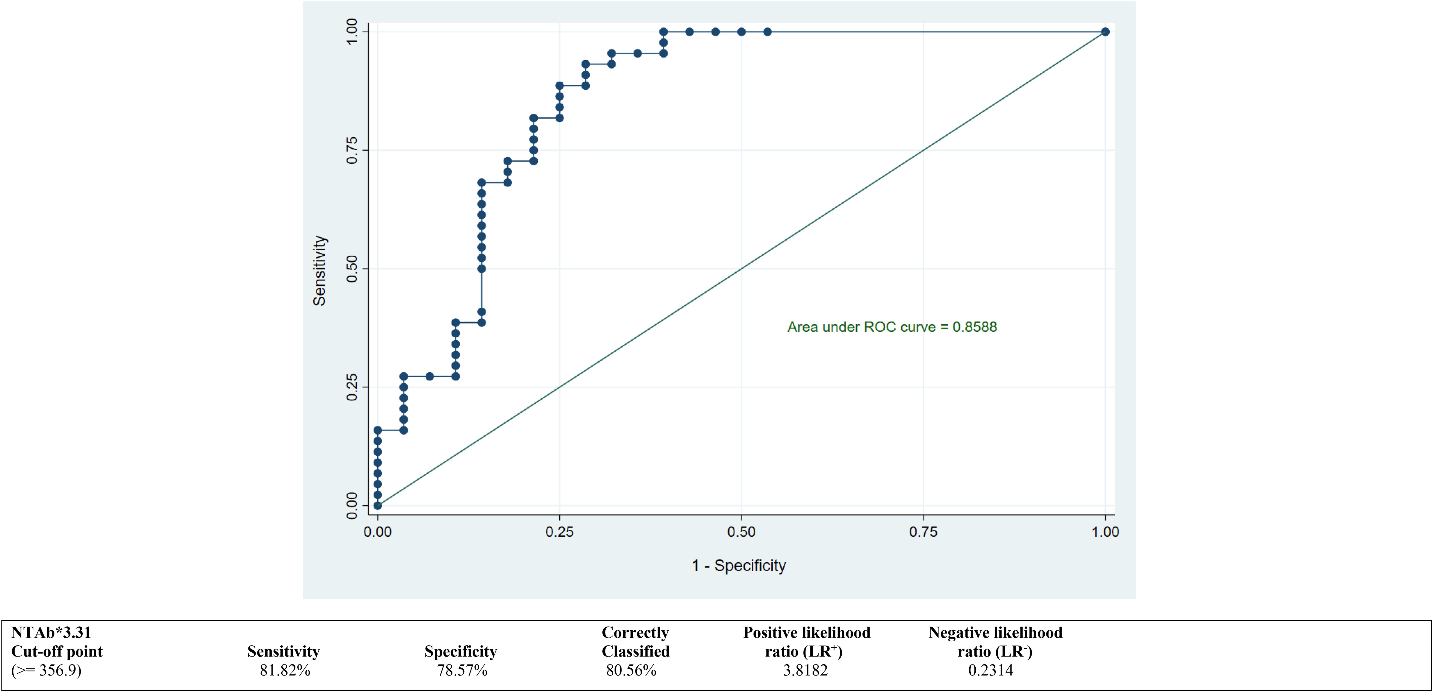 Figure 2. ROC curve to determine an optimum cutoff value for NTAb*3.31 antibodies in the COVID-19-vaccinated group. ROC, receiver operating characteristic.