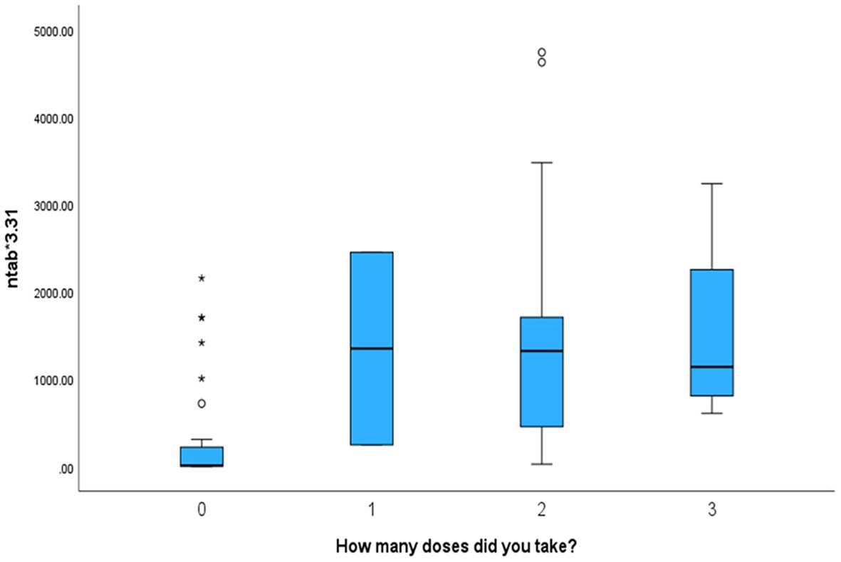 Figure 4. The box plot depicts that mothers who received more vaccination doses against COVID-19 had higher values of NTAb*3.31 antibodies in the serum of their offspring.