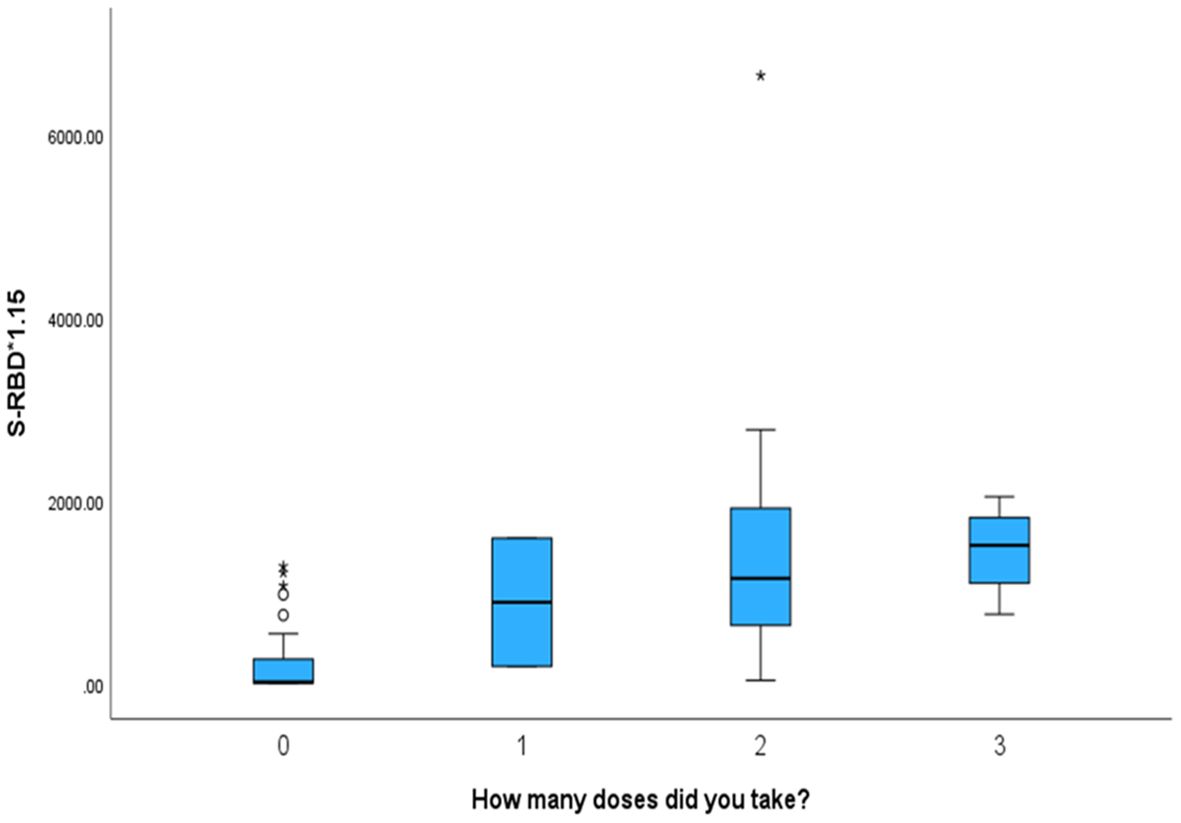 Figure 5. The box plot depicts that mothers who received more vaccination doses against COVID-19 had higher values of S-RBD*1.15 antibodies in the serum of their offspring.