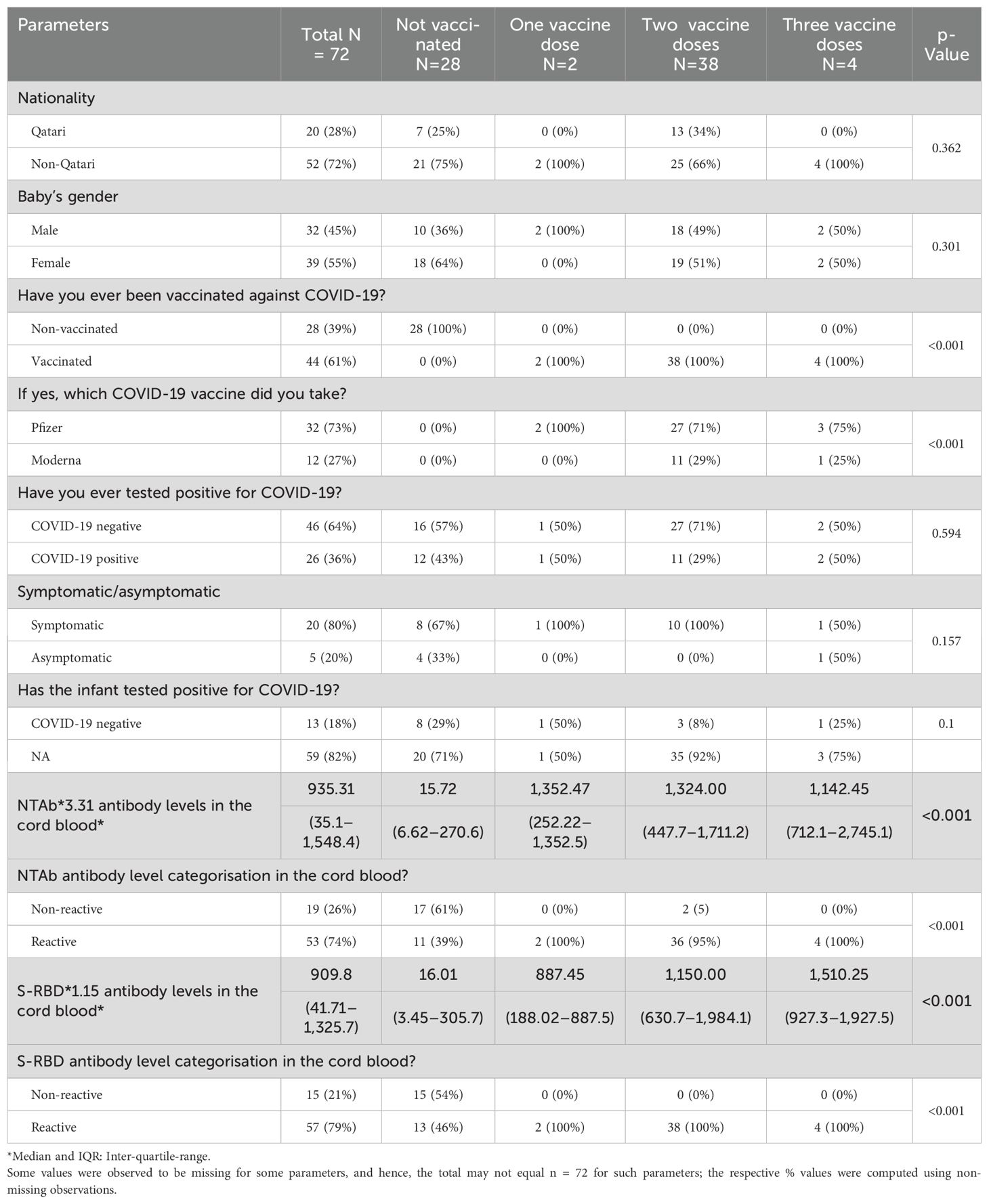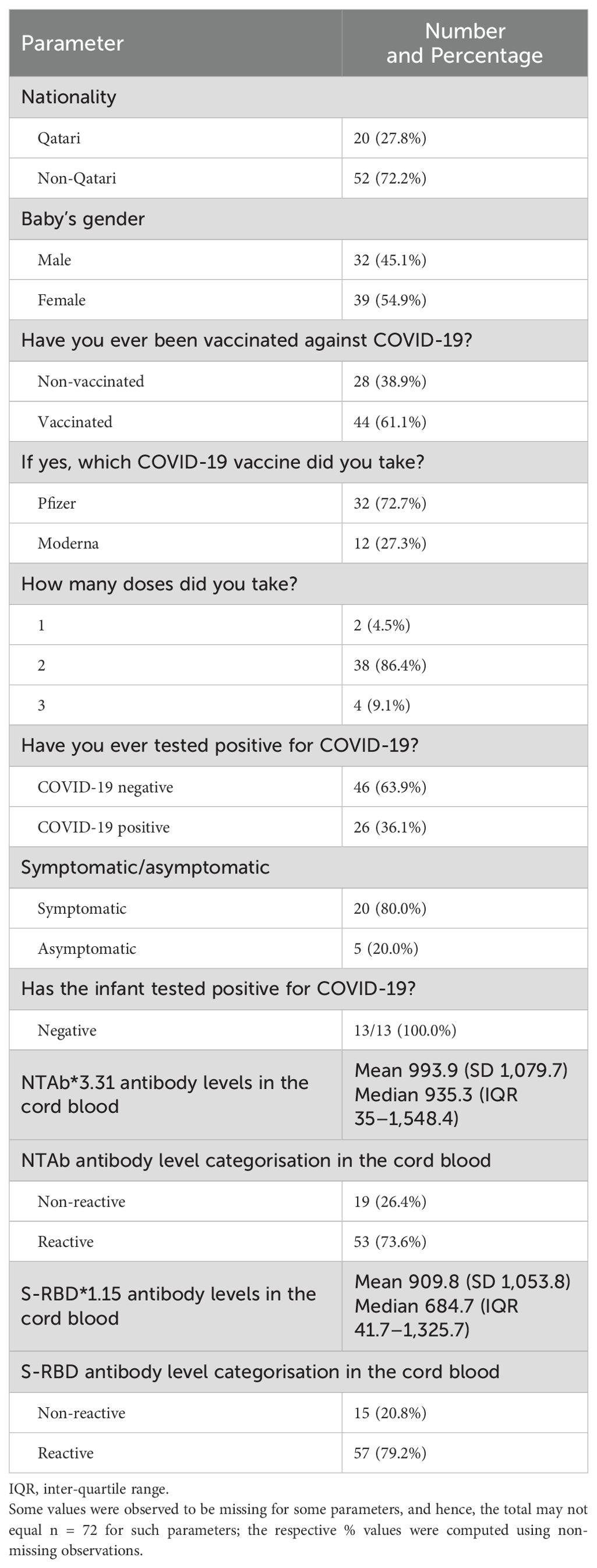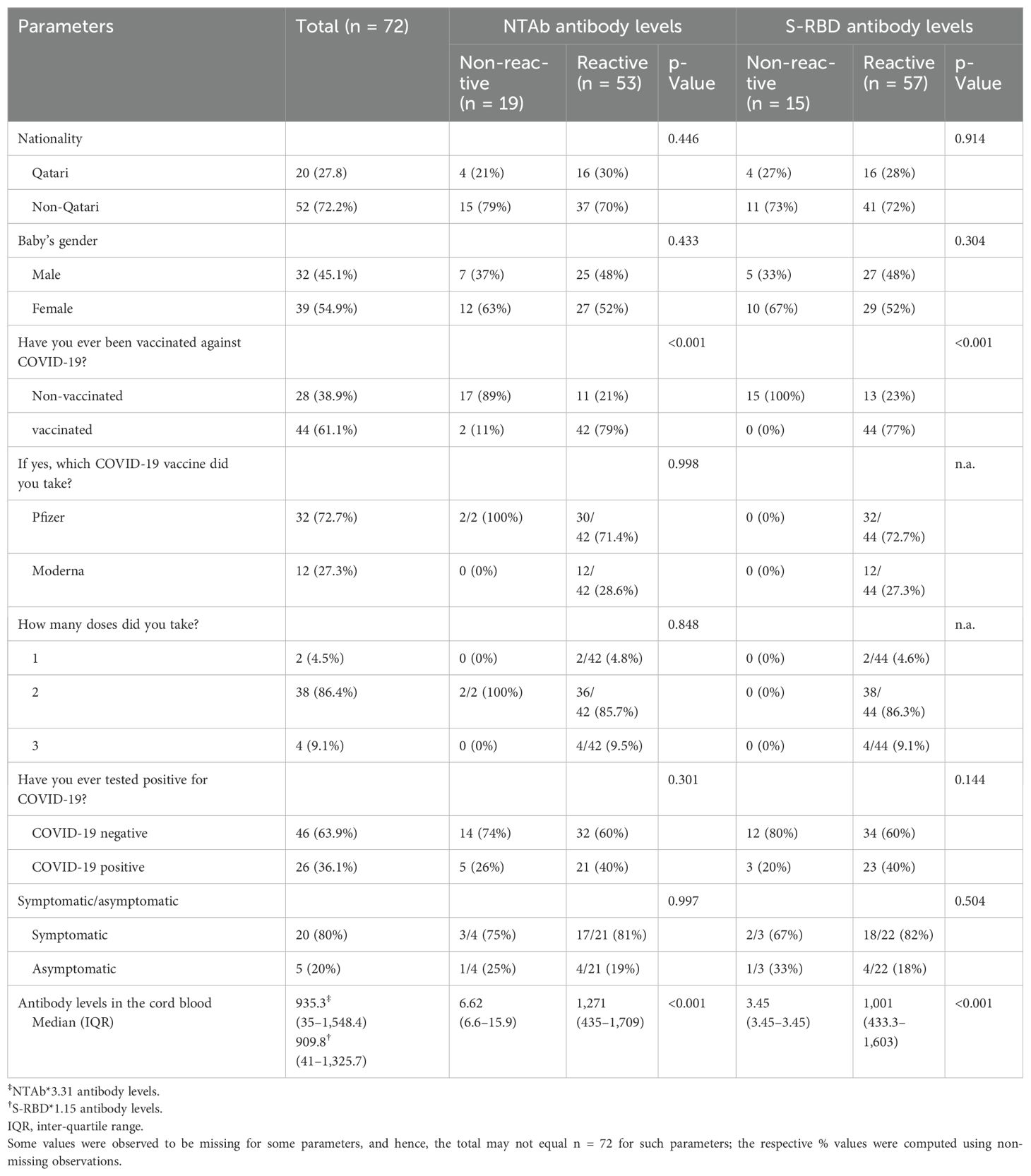 Descriptive statistics were used to summarise and determine the participants’ characteristics and data distribution. The normally distributed data were presented as mean with standard deviation (SD), whereas median and inter-quartile range (IQR) were used for skewed or non-normal data distribution. Categorical data were summarised using frequencies and respective percentages. Various parameters measured on categorical scales and their association with categorised NTAb and S-RBD antibody levels in cord blood (non-reactive and reactive) and the number of vaccination doses were evaluated using the chi-square (χ2) test, Fisher’s exact, or Yates’s corrected chi-square tests, as appropriate. Quantitative data outcomes (NTAb and S-RBD antibody levels in cord blood) between the two independent groups (reactive and non-reactive) were compared using a non-parametric Mann–Whitney U test.