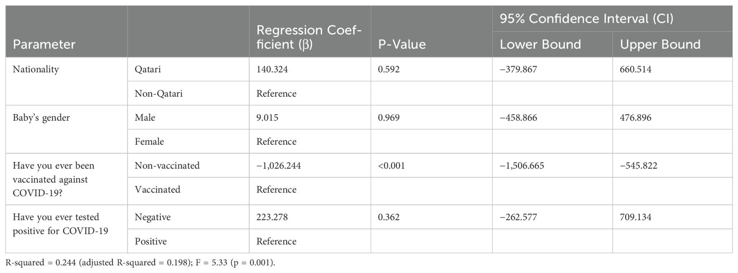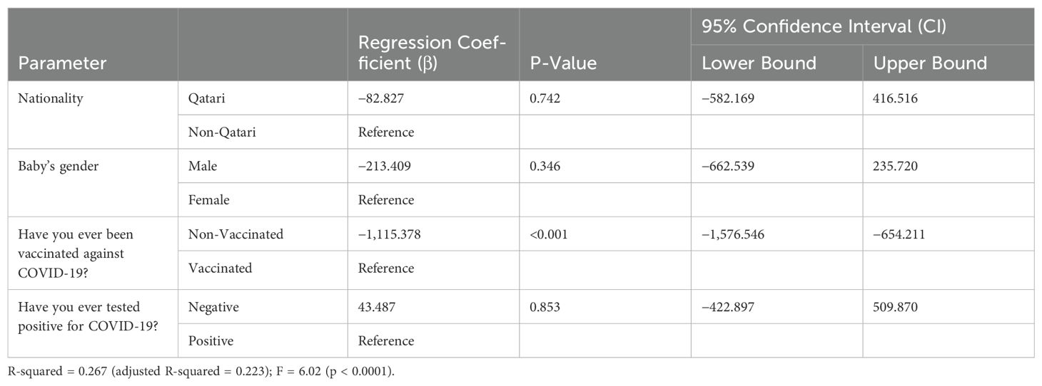 Multivariate linear regression analysis was performed using dependent variables NTAb*3.31 and S-RBD*1.15 antibodies and independent predictor variables nationality, infant’s gender, vaccination status against COVID-19, and COVID-19 test status; the multivariate linear regression analysis results indicated that vaccination against COVID-19 remained a potential significant (p < 0.0001) predictor for both NTAb*3.31 and S-RBD*1.15 antibodies after adjusting other predictor variables outlined in Tables 4 and 5.