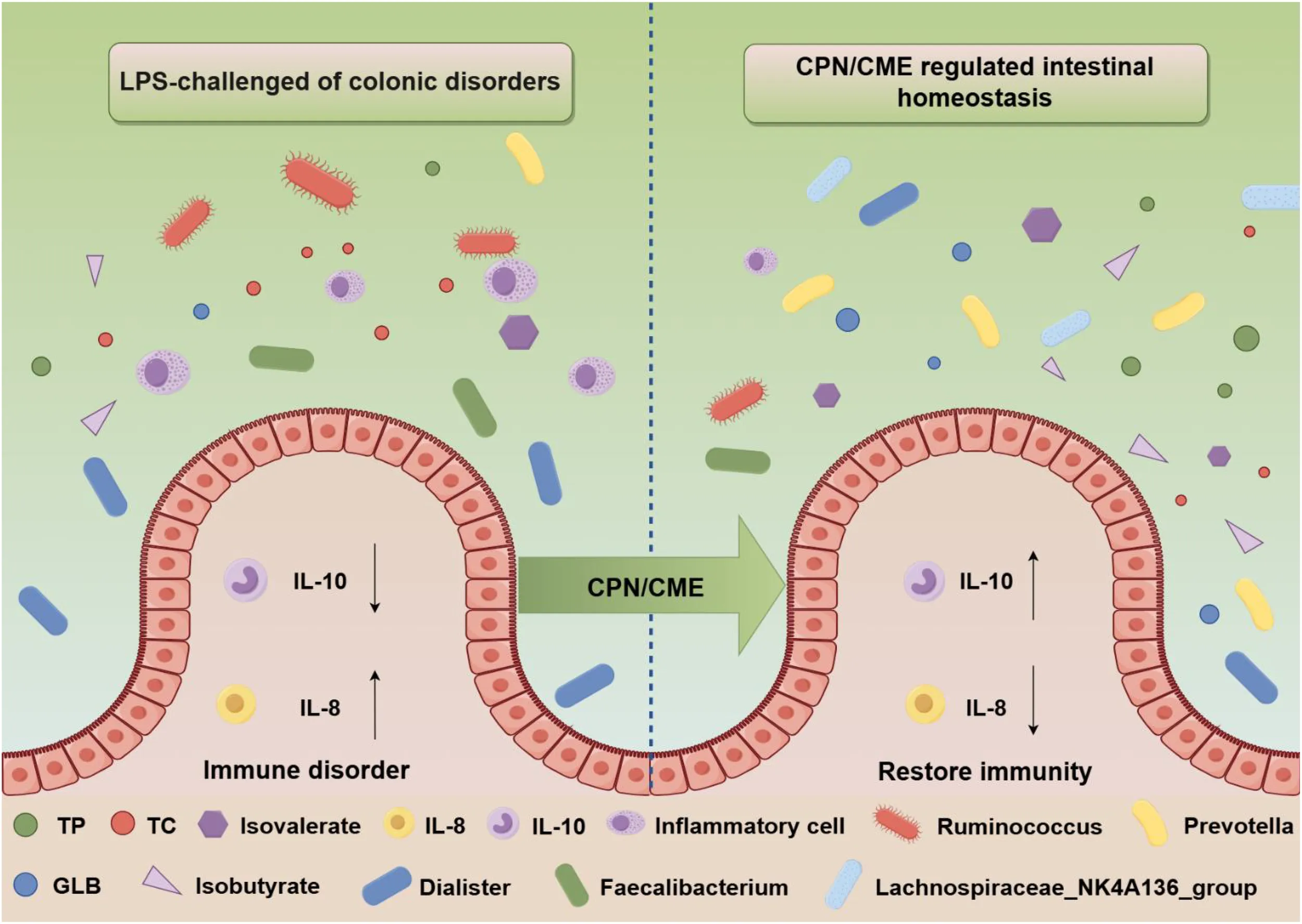 Results: The findings demonstrated that CPN or CME attenuated intestinal morphology damage with LPS-challenged piglets. CPN and CME alleviated intestinal microbiota dysbiosis and metabolic disorders under LPS-challenged by enriching serum protein levels, regulating of inflammatory cytokine secretion and altering colonic microbial composition. Colonic microbiota analysis that the CPN improved the relative abundance of Acidobacteriota and inhibited Faecalibacterium, CME promoted the relative abundance of Prevotella and Lachnospiraceae NK4A136group. Meanwhile, the alleviation of colonic damage is achieved through modulation of metabolic pathways linked to tryptophan metabolism, biosynthesis of amino acids and butanoate metabolism.