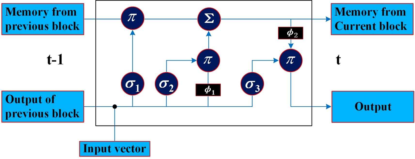 The LSTM repeated module is composed of three activation function gates (i.e., forget gate (σ1), input gate (σ2), and output gate (σ3)) and two tanh activation functions regarding the output, as shown in Figure 2. The bullet symbol (·) represents the concatenation operation, and the π and Σ symbols represent element-wise multiplication and addition, respectively. The fundamental component of LSTM is the cell state, where a line comes from the previous block memory (St − 1) and connects to the current block memory (St). Afterward, the flow of information straight down the line is allowed. In other words, the forgetting part of the memory in the cell state is determined by the input of the cell state at the previous time point in the forget gate, the memory, and the intermediate output of the cell state. The data to be added to the cell state are adjusted by the sigmoid function, and the intermediate output is determined by the updated memory cell state and the output. In this work, the characteristic sequence of the phase space extracted and reconstructed by CNN was modeled using an LSTM model. By learning the characteristic time series, the nonlinear process of POD12 evolution is represented, the future state of POD12 (i.e., at time t + 1) is predicted more accurately, and the risk level of POD12 is evaluated according to the future state of the POD12 characteristic variables.
