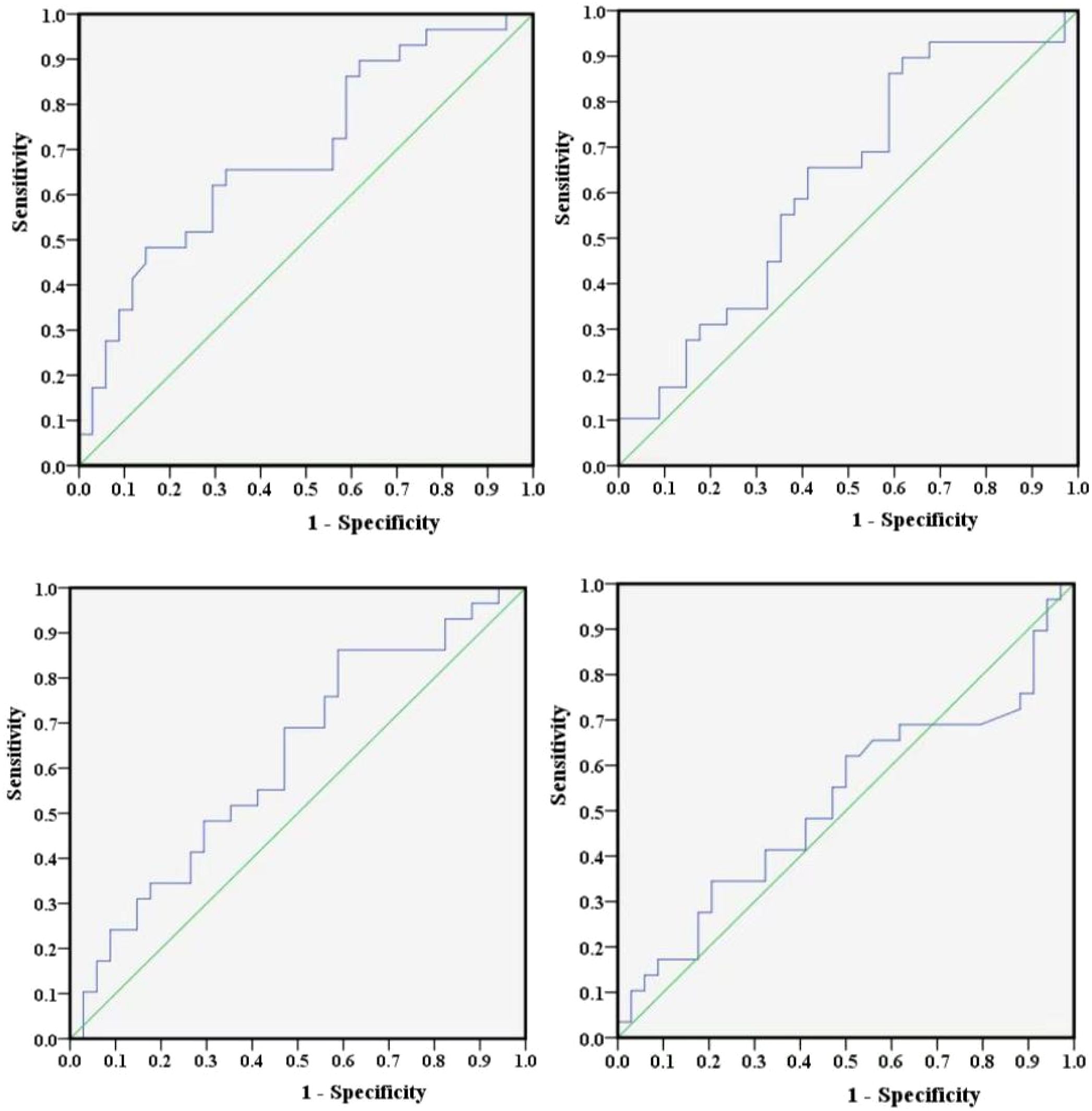 In addition, this study employed Youden’s index to determine the optimal cut-off values for NLR, PLR, LMR, and SII. Youden’s index serves as a diagnostic performance metric for evaluating the ability of a screening method to distinguish between true patients and nonpatients. It is computed by subtracting (1 − specificity) from sensitivity, and the test variable value corresponding to its maximum represents the diagnostic threshold for that particular method. Furthermore, ROC curves for NLR, PLR, LMR, and SII were plotted separately using the occurrence of POD12 as the study endpoint (Figure 3). The sensitivity and specificity values corresponding to the maximum Youden’s index for these curves were (0.483, 0.853), (0.897, 0.382), (0.862, 0.412), and (0.345, 0.794), respectively. By integrating the actual clinical values from 63 patients, the optimal cut-off values were further determined to be 1.73, 306.494, 4.867, and 304.2, respectively.