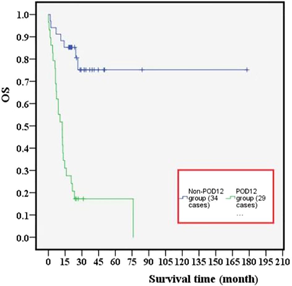 Among 63 previously untreated DLBCL patients, 29 cases (46%) experienced POD12. The OS values in the POD12 group were significantly lower than those in the non-POD12 group (p< 0.001; Figure 4), with 3-year OS rates of 3.45% and 23.53%, respectively.