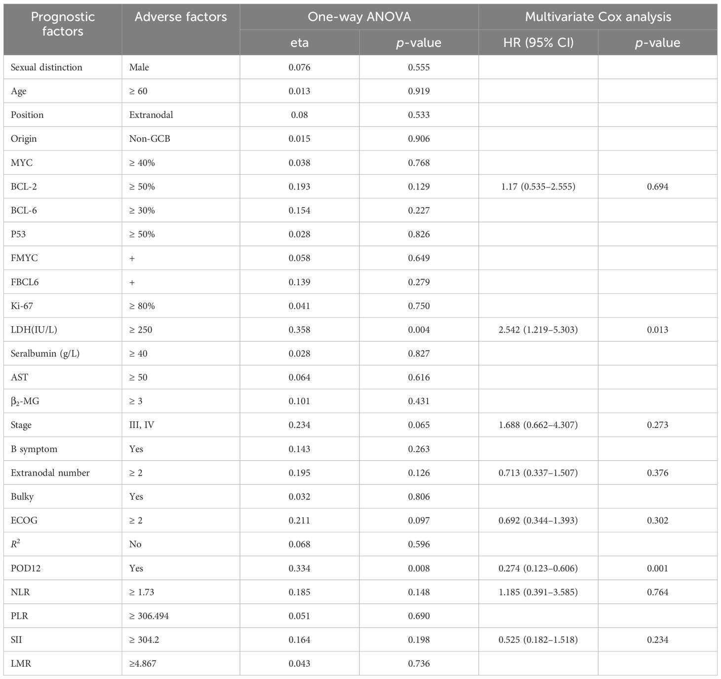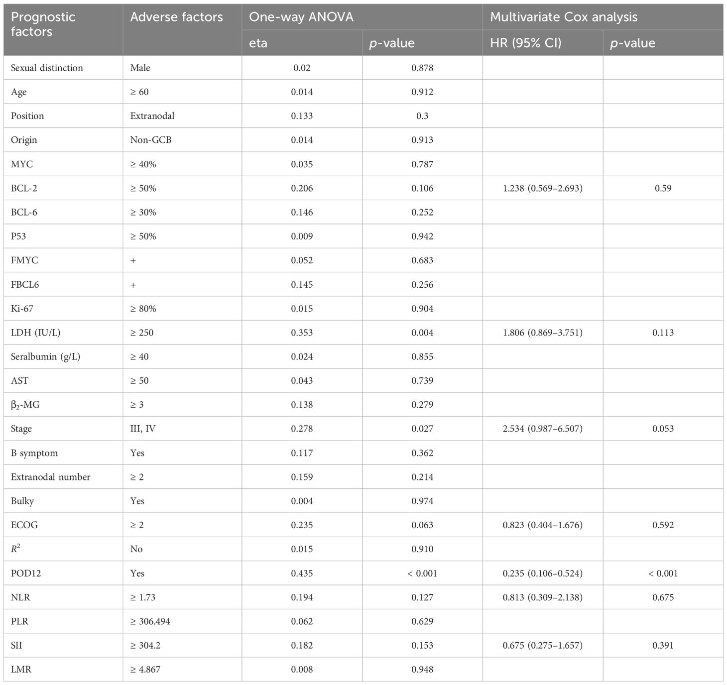 Different from the PFS or OS, POD12 is not influenced by deaths caused by other factors (such as treatment-related adverse reactions) or by second-line treatment. It may better reflect the invasiveness and/or treatment resistance of the disease itself. At present, some conventional clinical prognostic evaluation systems, such as the international prognostic index (IPI) (10), cell-of-origin classification (11, 12), simultaneous Bcl-2 and C-Myc and/or Bcl-6 rearrangement, dual expression (DE) of C-Myc and Bcl-2, increased expression of mutant p53 protein (13–16), high-grade B-cell lymphoma, double-hit/triple-hit DLBCL (15, 17, 18), can be used to predict the overall survival of patients with DLBCL. However, the relationship between these prognostic factors and POD12 in DLBCL remains uncertain (19). In addition, patients with POD12 may initially achieve CR with first-line treatment but then experience rapid disease progression. Their tumor cells may not respond well to follow-up therapies, resulting in poor overall survival (OS) (20, 21). Similarly, POD12 has been shown to have important prognostic value. Ma et al. (4) found that DLBCL patients treated with first-line rituximab + cyclophosphamide + adriamycin + vincristine + prednisone (R-CHOP) had significantly lower OS rates if they experienced POD12 compared to those who did not (p< 0.001). These patients also responded poorly to subsequent rescue treatment, indicating that POD12 carries strong prognostic significance across various conventional treatment regimens.