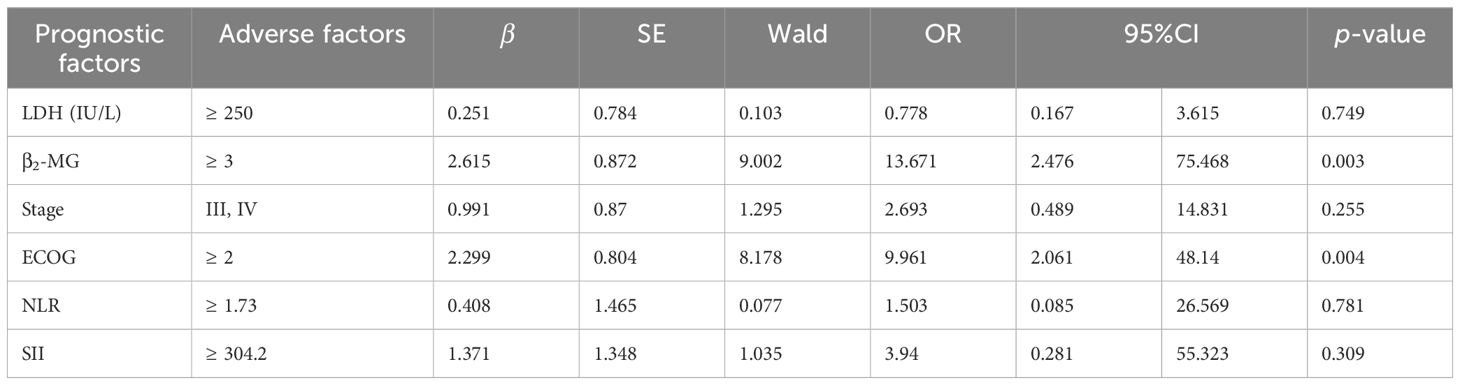 Among the 63 patients who underwent immunohistochemical detection, univariate logistic regression analysis—adjusted for the first-line chemotherapy regimen—identified LDH ≥ 250 IU/L, β2-MG ≥ 3 µmol/L, stages III–IV, ECOG ≥ 2, NLR ≥ 1.73, SII ≥ 304.2 as potential risk factors for POD12 (Table 3). Furthermore, multivariate logistic regression analysis revealed that β2-MG ≥ 3 µmol/L and ECOG ≥ 2 were independent risk factors for POD12 (p< 0.05; Table 4).