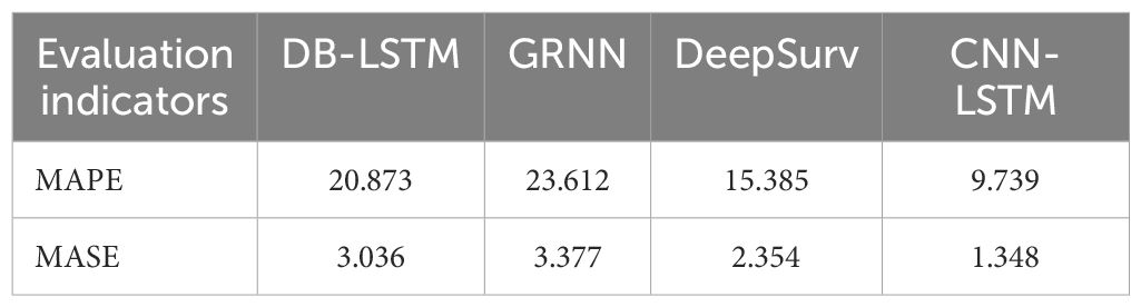 Subsequently, to comparatively evaluate the predictive performance of the models, this study divided the case dataset into a training set and a test set at a ratio of 9:1. First, the GRNN, DB-LSTM [introduced by Zhou and Xu (34)], DeepSurv [introduced by Katzman et al. (35)], and CNN-LSTM models were trained on the training set. After training, the models were applied to the test set, with the results presented in Table 6.