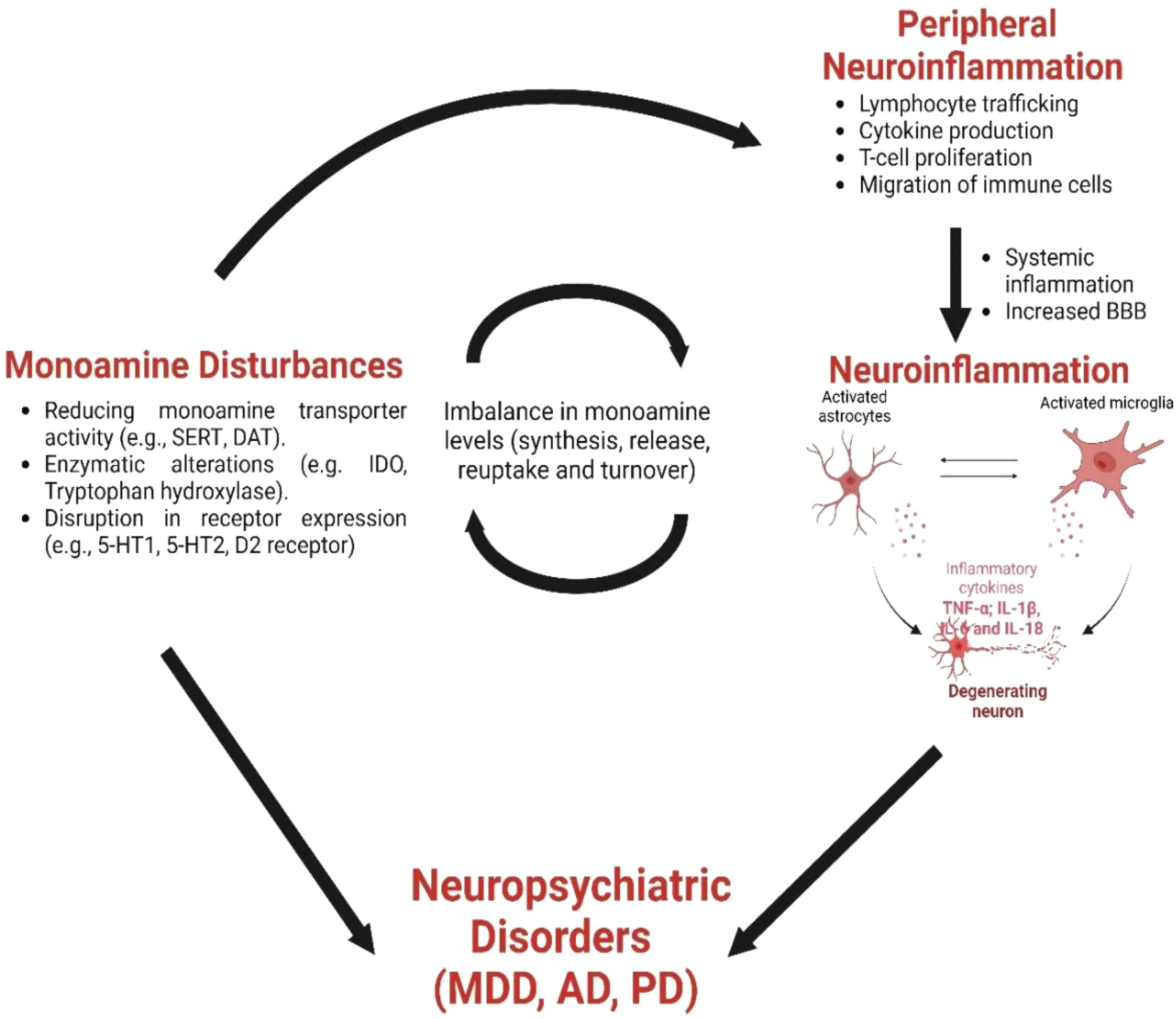 Research into neuroinflammation and its connection to psychiatric disorders is expanding quickly. A better understanding of this relationship could revolutionize how we treat mental illnesses. This could lead to more targeted and effective therapies that alleviate symptoms and address the underlying causes of these disorders. Classical psychiatric disorders (e.g., schizophrenia, autism, major depression, bipolar disorder, and obsessive-compulsive disorder) and neurological diseases with psychiatric symptoms (e.g. AD and PD) are widely associated with neuroinflammation and immunological abnormalities, in addition to disrupted neurotransmission. Many of these disorders exhibit both chronic neuroinflammation and dysregulated monoamine signaling, suggesting potential interconnections (9, 82, 144). This section discusses the interconnection between each monoamine system and neuroinflammation and how these processes contribute to neurological diseases, particularly MDD, AD, and PD.
