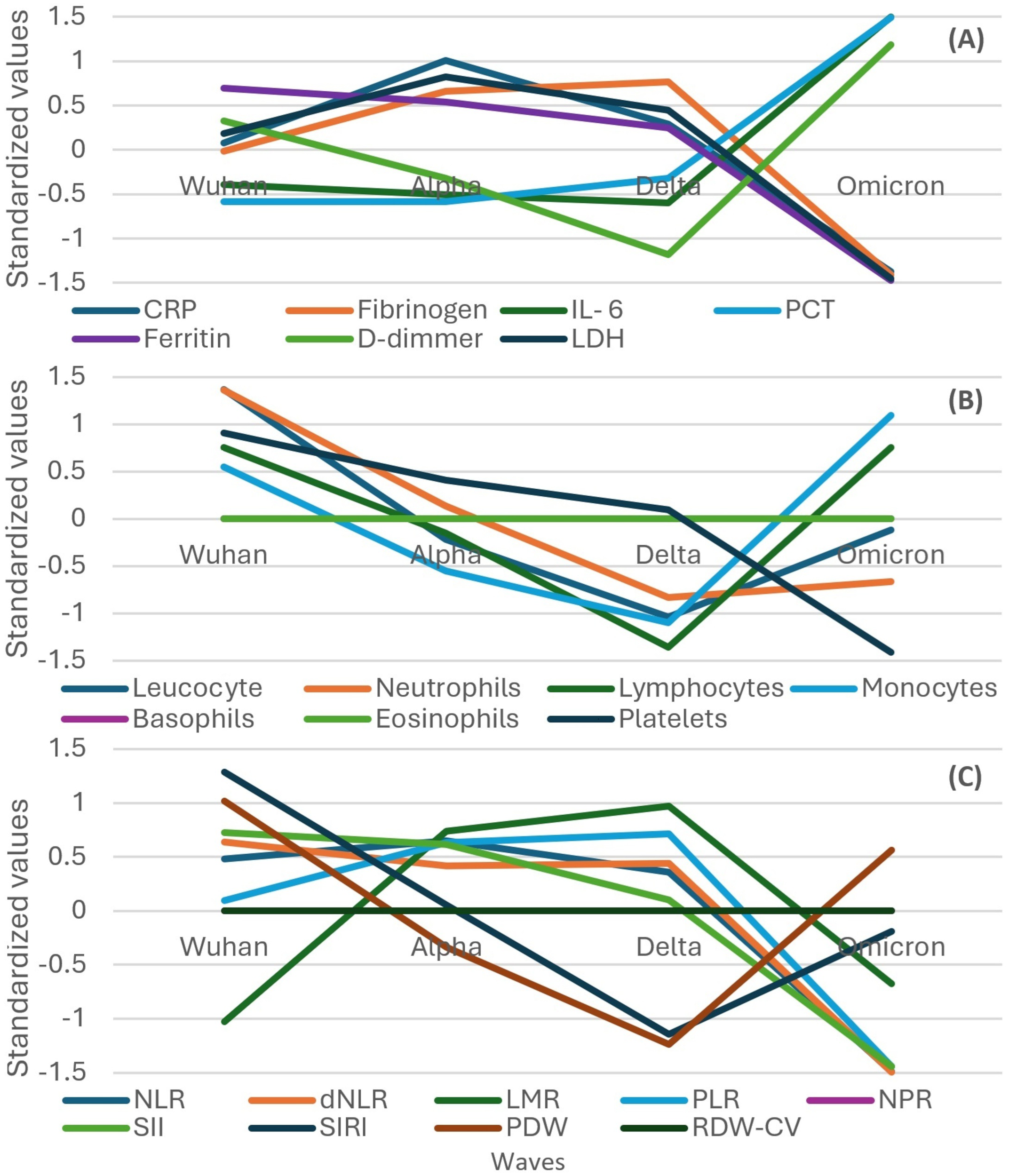 The evolution of inflammatory biomarkers across different waves was presented graphically, using standardized values, in Figures 2–4.