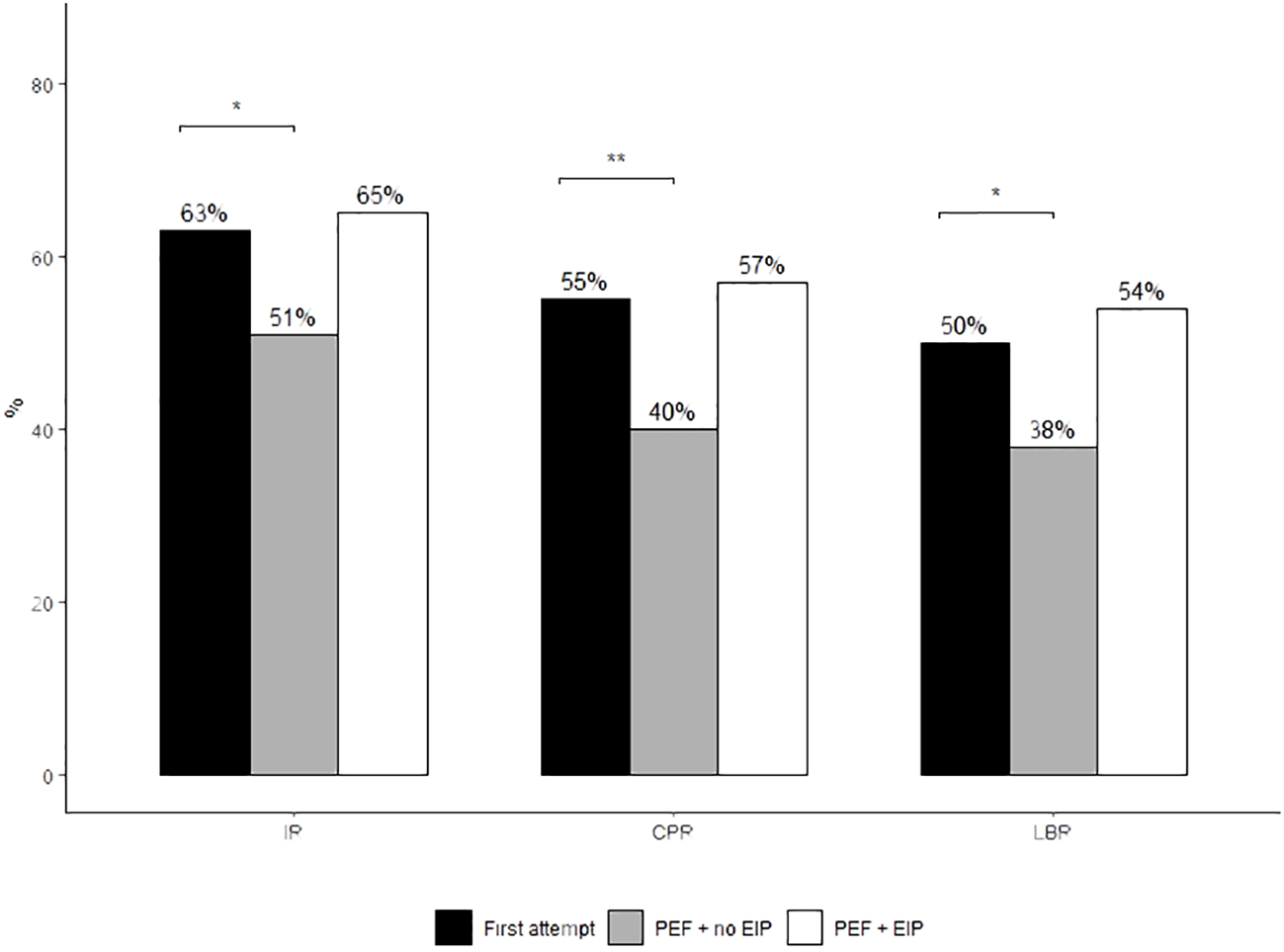 Across all clinical outcomes, the PEF + EIP group achieved the highest rates (Table 3). This group achieved an implantation rate of 65%, a CPR of 57% with a final LBR of 54%. These rates were comparable with the first attempt group (65% vs 63%, P=1, 57% vs 55%, P= 0.9, 54% vs 50%, P= 0.7, respectively). This was the case despite the first attempt group having a significantly younger average oocyte age, greater number of embryos transferred per transfer and a greater proportion of embryos transferred morphologically graded as “BB” and above than both the PEF +EIP and no EIP groups (Table 3). In contrast, the PEF + no EIP group had a 14% lower implantation rate (51%) and a 16% lower LBR (38%) than the EIP group (Figure 1), despite having the youngest oocyte age across all groups and the greatest number of double embryo transfers, as well as no apparent differences in the proportion of “good quality” embryos transferred than the EIP group (Table 3). The IRs, CPRs and LBRs between the first attempt and PEF + no EIP groups significantly differed (63% vs 51%, P=0.02, 55% vs 40%, P=0.003, 50% vs 38%, P=0.02, respectively). Most likely due to small cohort size providing limited statistical power, no significant differences were found between the PEF + EIP group and the PEF + no EIP group, despite the largest differences in rates seen between these groups (IR; 65% vs 51%, P=0.2, LBR; 54% vs 38%, P=0.1, respectively). Miscarriage rates were comparable between groups, with a 2% lower miscarriage rate seen in the PEF + EIP group (PEF + EIP 11%; PEF + no EIP 13%; First attempt 13%).