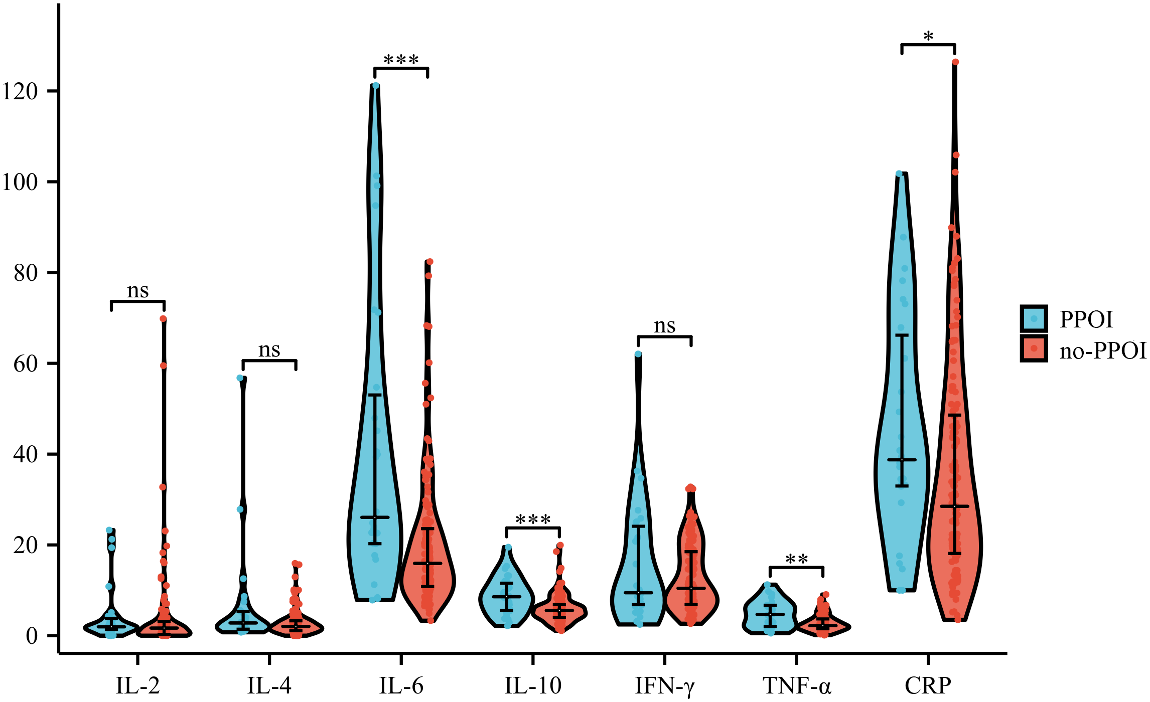 Differences in inflammatory factors of patients with and without PPOI. ViolinPlot shows that IL-6 (P<0.001), IL-10 (P<0.001), TNF-α (P<0.01), and CRP (P<0.05) are upregulated in PPOI patients after surgery, while IL-2, IL-4, and IFN-γ were found no difference.