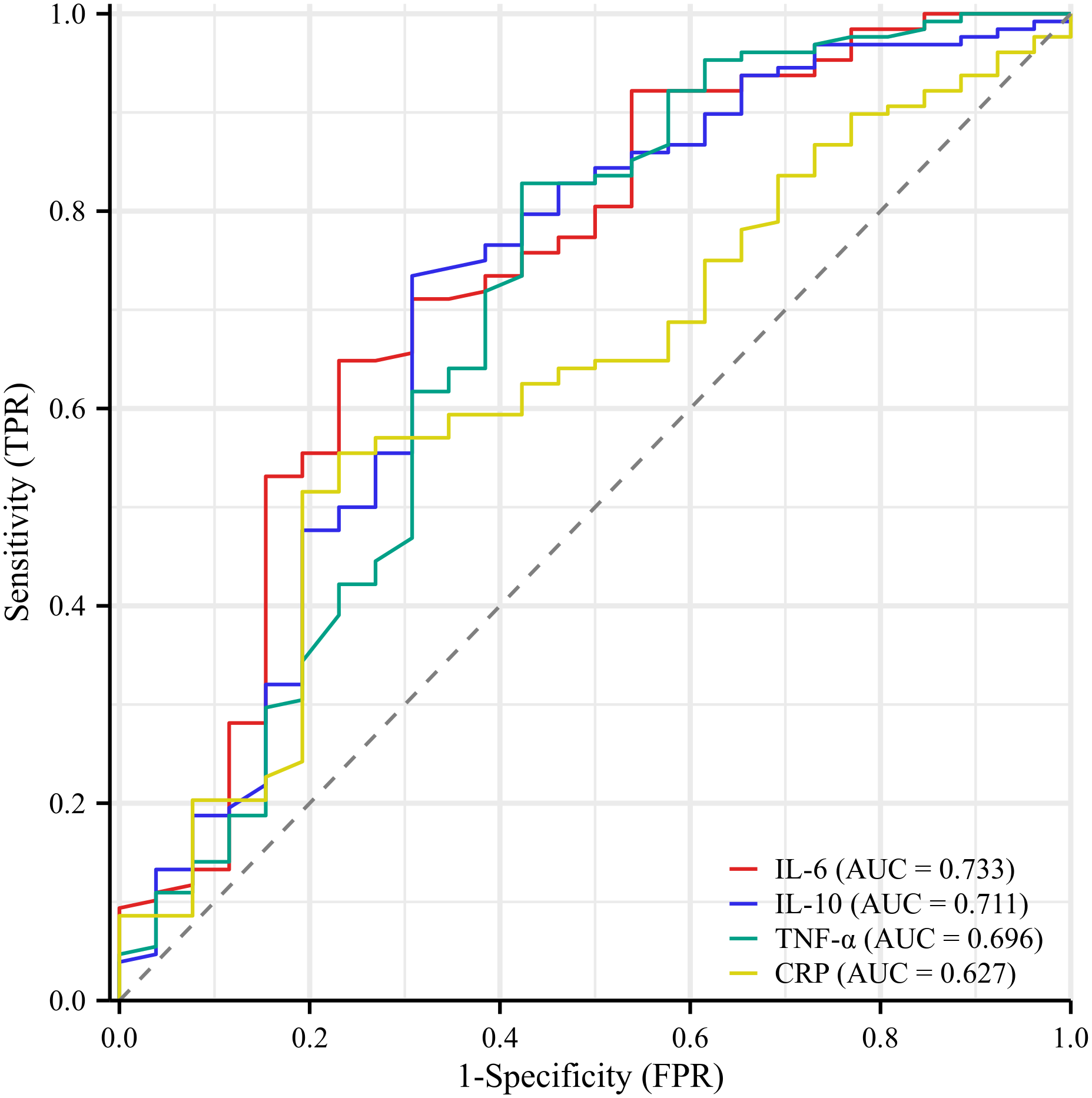 Receiver operator characteristic curve analysis of inflammatory indicators. The AUC were 0.733 for IL-6, 0.711 for IL-10, 0.696 for TNF-α, and 0.627 for CRP.