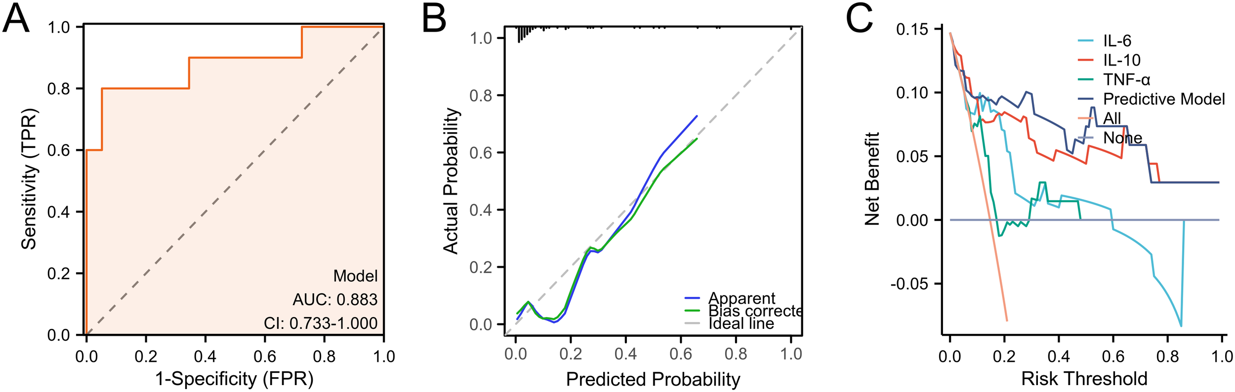 Next, we analyzed the risk factors for PPOI occurrence by logistic regression model. Univariate examination showed that age ≥ 65 (P = 0.001, HR = 5.556, 95%CI: 2.085~14.802), IL-6 ≥ 20.0 pg/ml (P <0.001, HR = 6.148, 95%CI: 2.303~16.411), IL-10 ≥ 6.78 pg/ml (P <0.001, HR = 6.221, 95%CI: 2.478~15.618), TNF-α ≥ 4.34 pg/ml (P <0.001, HR = 6.570, 95%CI: 2.662~16.216), and CRP ≥ 32.15 mg/L (P =0.004, HR = 4.152, 95%CI: 1.564~11.026) were significantly related the onset of PPOI. Subsequently, multivariate analysis demonstrated that age ≥ 65 (P =0.002, HR=6.092, 95%CI: 1.946~19.074), IL-6 ≥ 20.0 pg/ml (P = 0.007, HR = 4.639, 95%CI: 1.536~14.011), and IL-10 ≥ 6.78 pg/ml (P = 0.032, HR = 4.044, 95%CI: 1.132~14.455) were predictive factors for PPOI (shown in Table 3).