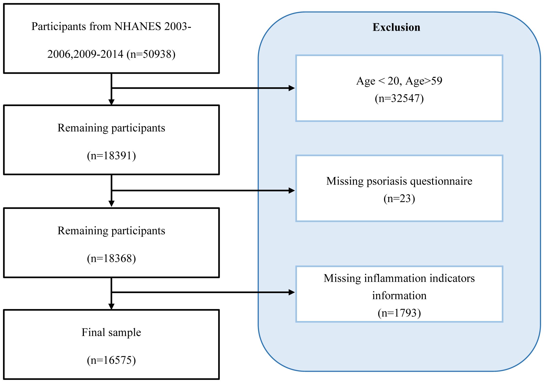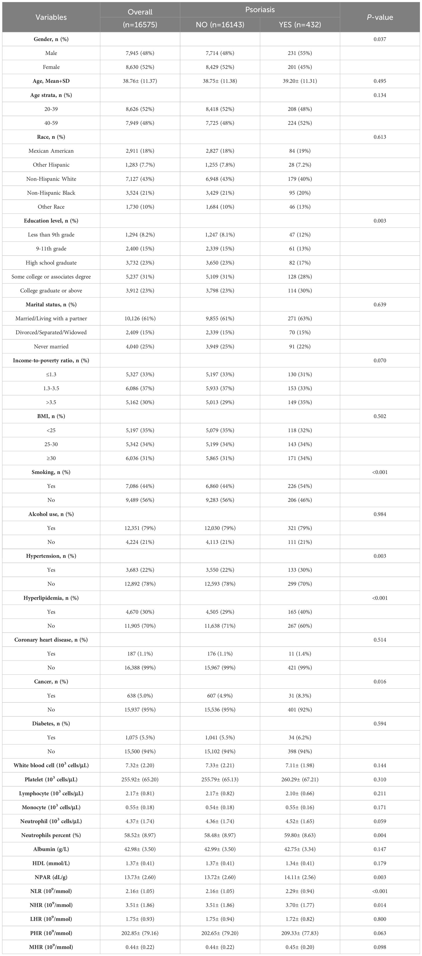 The survey in question gathered comprehensive information on demographic data, economic conditions, nutrition, and general health, creating a valuable dataset for studying public health trends and addressing emerging health issues. For this study, we used publicly available data from five two-year NHANES cycles (spanning from 2003-2006 and 2009-2014), focusing on adults aged 20 to 59. A total of 16,575 individuals participated in both the “complete blood count, high-density lipoprotein cholesterol, albumin” examination and the “Psoriasis” questionnaire. Participants were excluded if they lacked specific psoriasis assessment data, had insufficient information to calculate inflammation indicators NPAR, NLR, NHR, LHR, PHR, and MHR, or were outside the specified age range. Ethical clearance for the NHANES project was provided by the National Center for Health Statistics, and all participants gave written consent. In the final analysis, the research group consisted of 432 participants with psoriasis and 16,143 without, making up a total sample size of 16,575 adults (Figure 1).