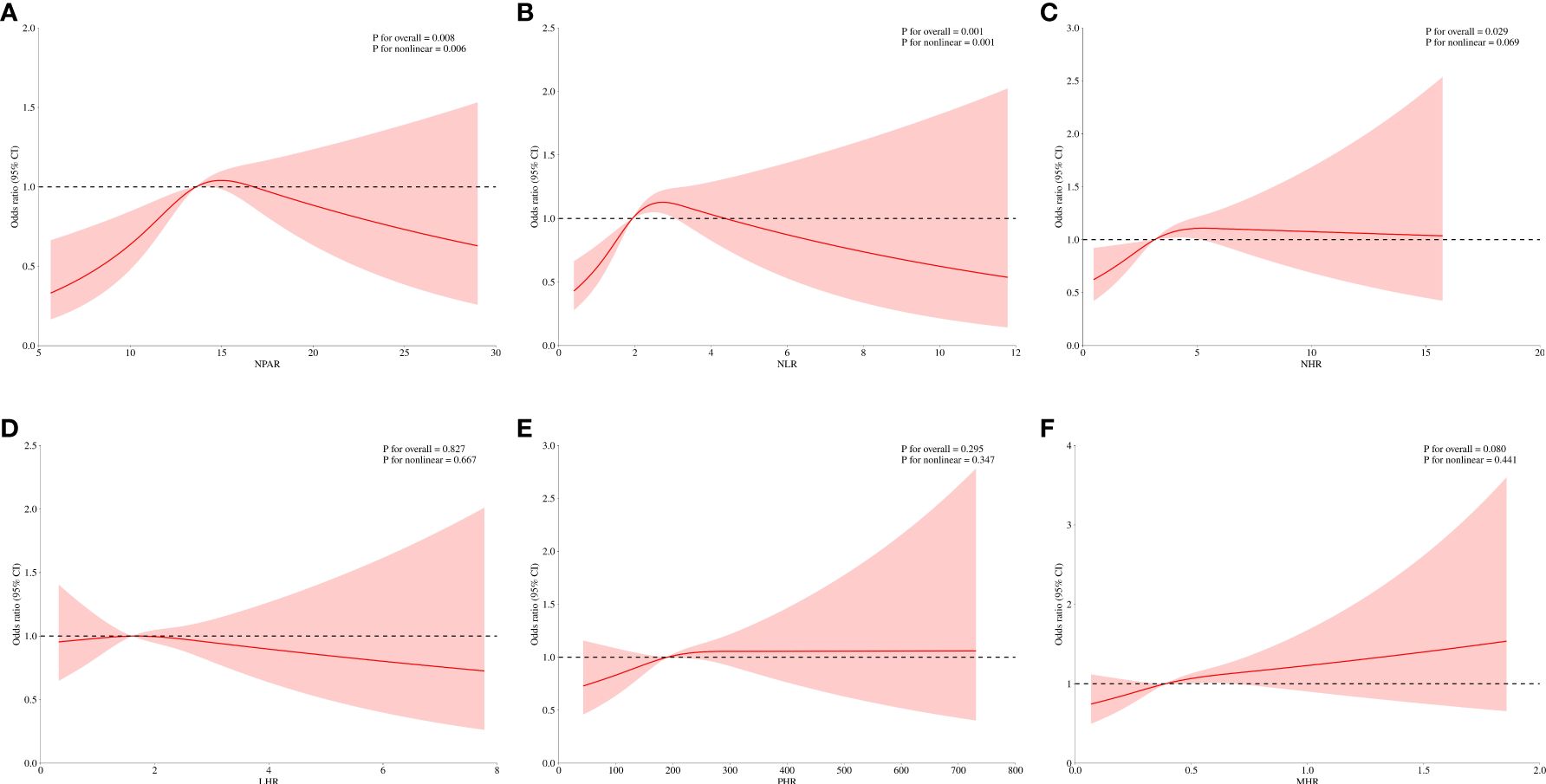 Figure 2. Smooth curve fitting for systemic inflammatory indicators with psoriasis. (A) NPAR and psoriasis; (B) NLR and psoriasis; (C) NHR and psoriasis; (D) LHR and psoriasis; (E) PHR and psoriasis; (F) MHR and psoriasis.