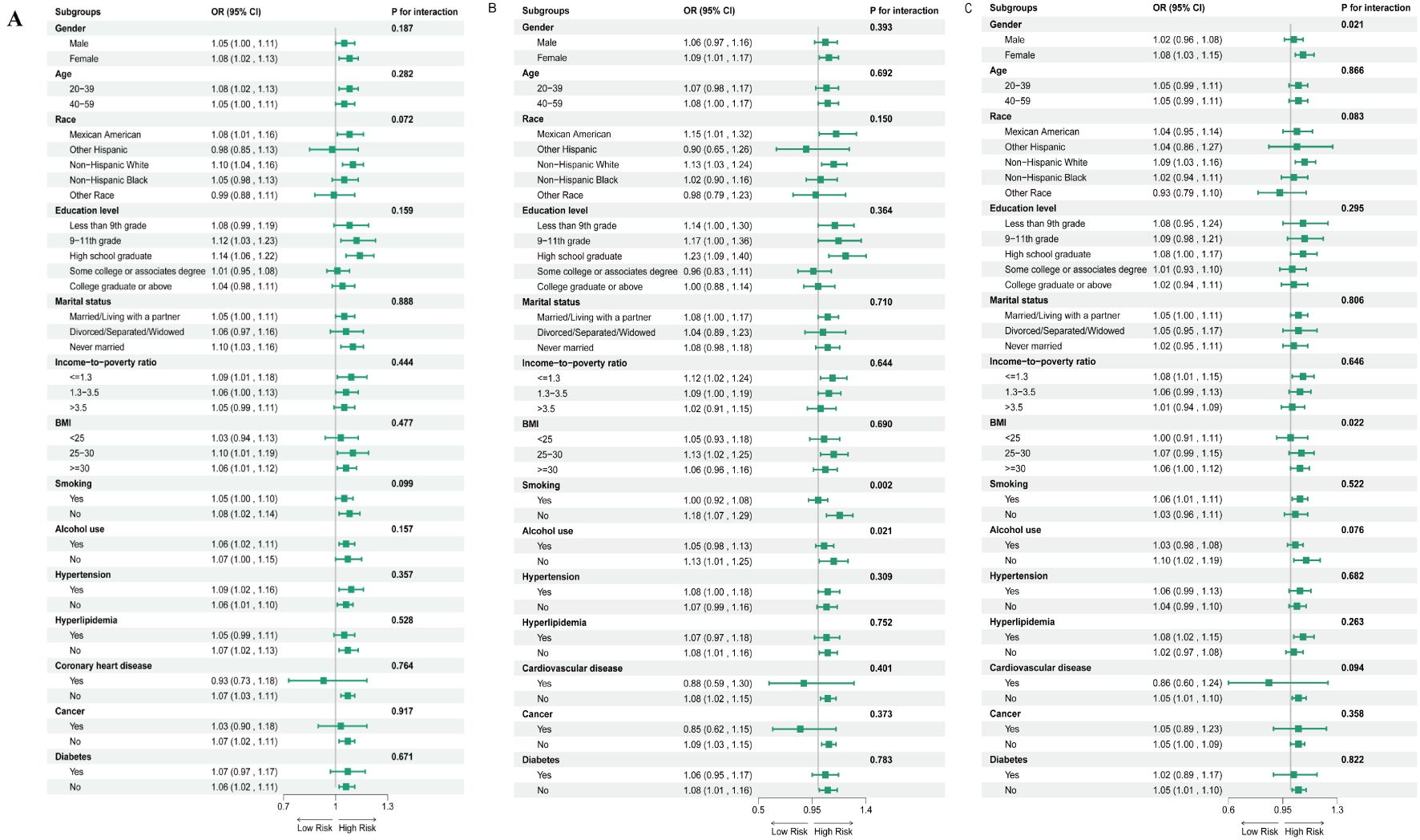 Figure 3. Subgroup analysis of assessing the association between quartile 4 of NPAR (A), NLR (B) and NHR (C) with psoriasis (Figure 3), Adjustments were made for a range of demographic and health factors, including age, gender, race, marital status, education level, income-to-poverty ratio, BMI, smoking, alcohol usage, diabetes, cardiovascular disease, hypertension, hyperlipidemia, and cancer, with the stratification component in question being excluded. The figure depicts odds ratios (OR) represented by squares, and 95% CI indicated by horizontal lines.
