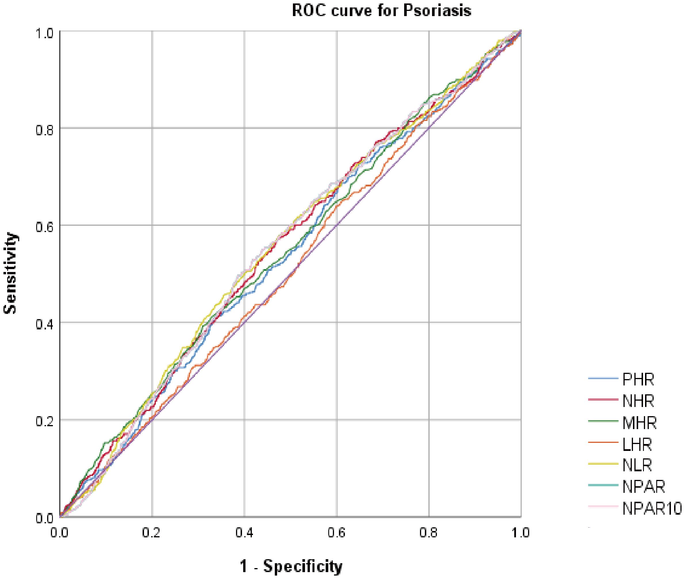 NPAR and NLR have a strong positive correlation with the prevalence of psoriasis, while NHR does not show a statistically significant association. Furthermore, NPAR and NLR outperform other inflammatory indicators, such as PHR, NHR, MHR, LHR, in accuracy and discriminative ability. This indicates that these two indicators may be more useful in identifying and distinguishing psoriasis from other conditions.
