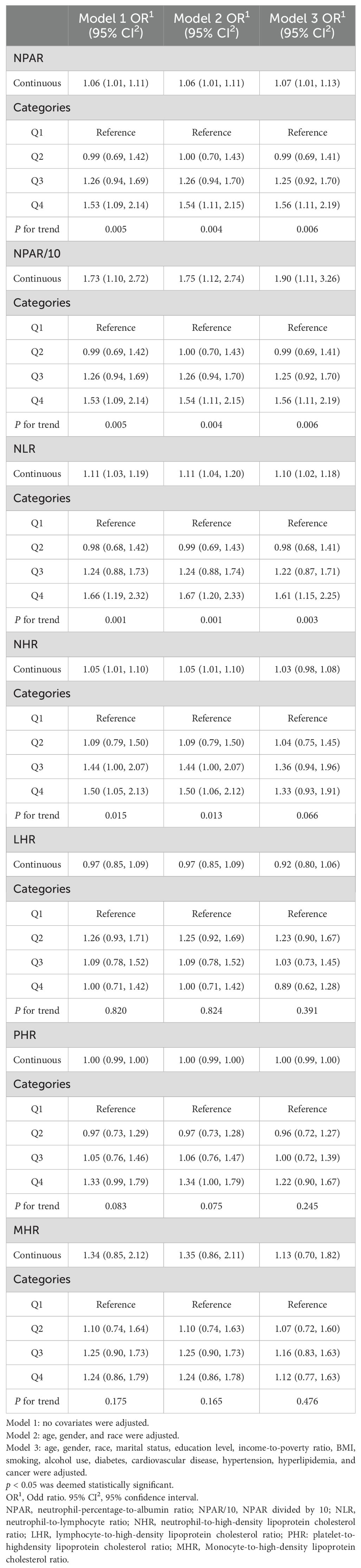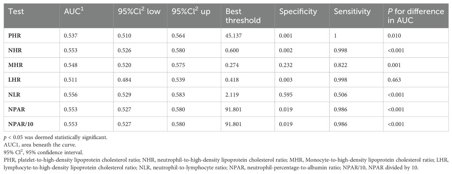 Methods: We analyzed data from 16,575 adults in the National Health and Nutrition Examination Survey (NHANES) from 2003–2006 and 2009–2014. Six inflammatory ratios—neutrophil percentageto-albumin ratio (NPAR), neutrophil-to-lymphocyte ratio (NLR), neutrophil-to-high-density lipoprotein cholesterol ratio (NHR), lymphocyte-to-high-density lipoprotein cholesterol ratio (LHR), platelet-to-high-density lipoprotein cholesterol ratio (PHR), and monocyte-to-high-density lipoprotein cholesterol ratio (MHR). Furthermore, subgroup analyses were performed to investigate whether these results remained true among various demographic groups. Finally, the predictive efficacy of inflammatory indicators was assessed through AUC values and ROC curves.