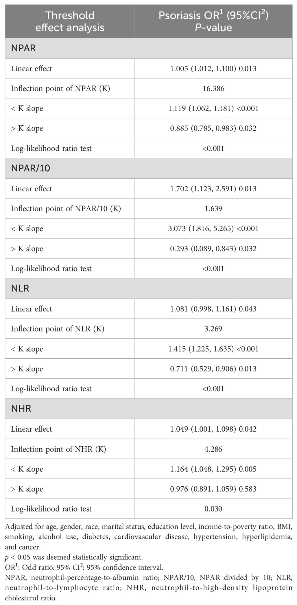 Table 3. Threshold effect analysis of systemic inflammatory indicators on psoriasis using a two-stage linear regression model in Model 3.