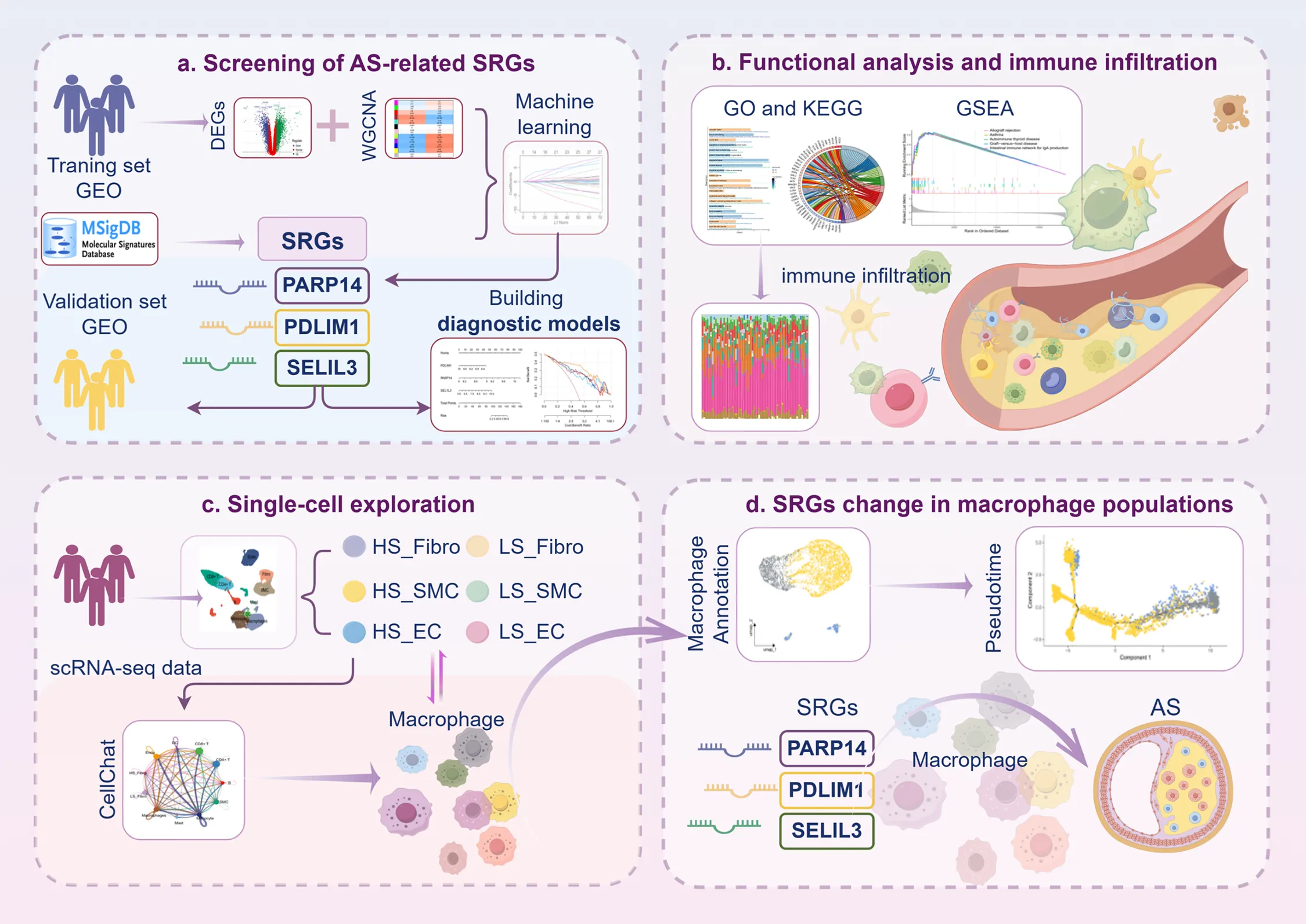 Early detection, prevention and intervention of AS are key to reducing morbidity and mortality, as well as alleviating the enormous socioeconomic burden of atherosclerotic CVD (35, 36). Current clinical strategies rely on imaging modalities (such as coronary artery calcium scoring, carotid ultrasound) and lipid analysis for risk stratification. However, traditional biomarkers, such as LDL do not fully predict residual risk in statin-treated patients —— risk of persistent cardiovascular events caused by non-lipid mechanisms such as residual inflammatory risk, thrombotic tendency, and metabolic derangements (37). Imaging techniques such as computed tomography angiography lack sensitivity in identifying vulnerable plaques with high lipid content or intraplaque hemorrhage (38). Advanced age constitutes a significant risk factor for AS, driven by both immune senescence and endothelial dysfunction. Aging is characterized by impaired immune surveillance and chronic low-grade inflammation (39). Key molecular mechanisms include the senescence-associated secretory phenotype, where senescent ECs, macrophages, and VSMC release pro-inflammatory cytokines (such as IL-6, IL-1β), matrix metalloproteinases, and reactive oxygen species. These factors collectively contribute to the destabilization of atherosclerotic plaques and expedite vascular remodeling (40, 41). In the present study, our findings confirmed that the SRGs poly (ADP-ribose) polymerase family member 14 (PARP14), SEL1L family member 3 (SEL1L3) and PDZ and LIM domain 1 (PDLIM1) are diagnostic genes of AS. These genes exhibit robust diagnostic capabilities, effectively distinguishing between early and advanced AS lesions, as well as between stable and unstable plaques. In addition, our results suggest that PDLIM1, PARP14 and SEL1L3 may drive macrophage transformation and promote the progression of AS lesions.