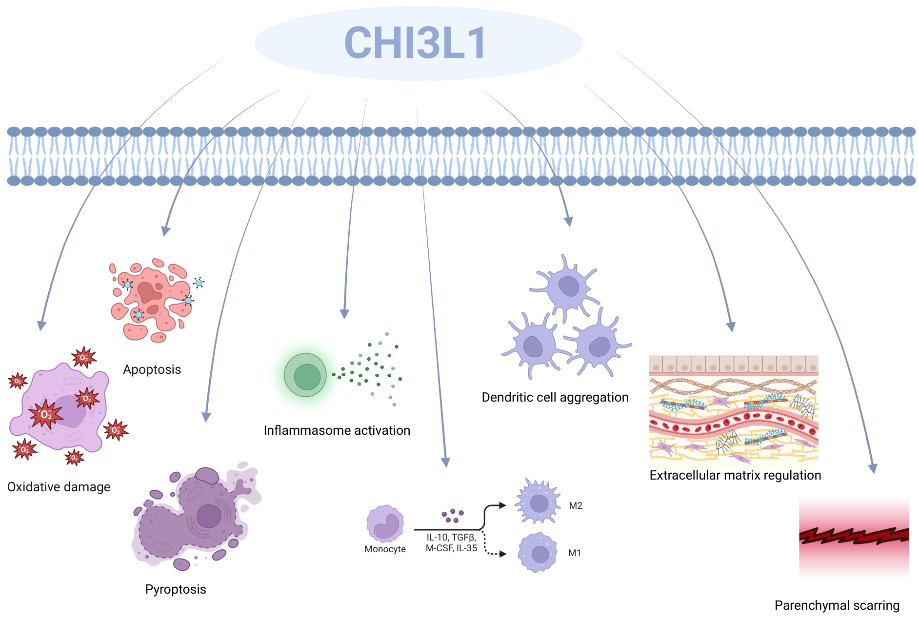 CHI3L1’s function includes oxidative damage, apoptosis, cellular pyrolysis, activation of inflammatory vesicles, development of M2 macrophages, aggregation of dendritic cells (DC), modification of the ECM (ECM), and the production of parenchymal scars.