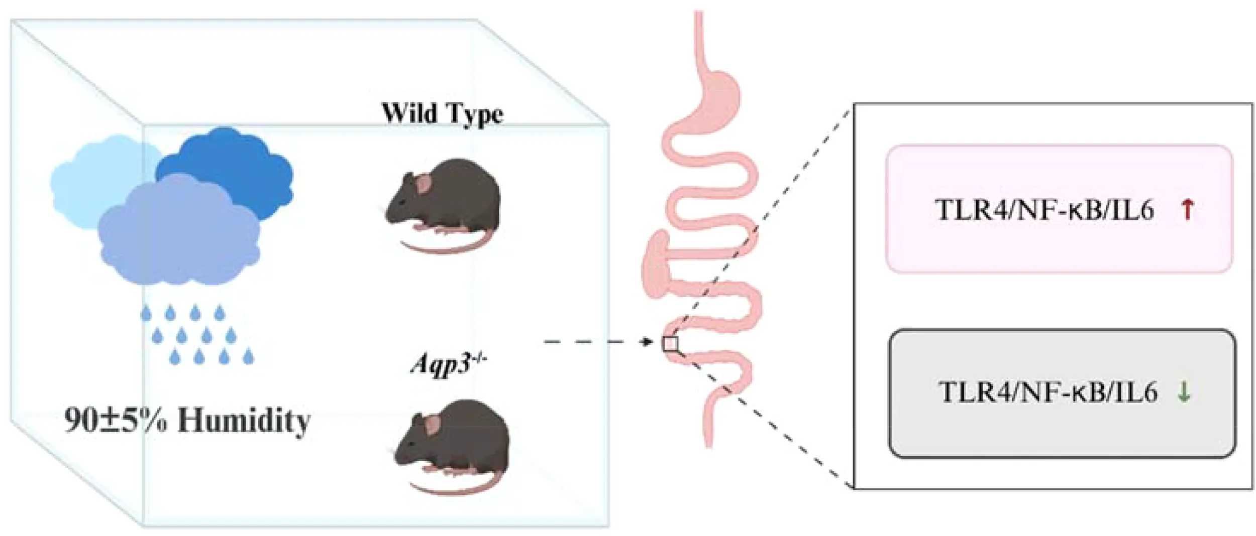 This study demonstrated the high-humidity environment induces an intestinal inflammatory response through AQP3, providing persuasive evidence for the pathogenesis of environmentally related diseases.