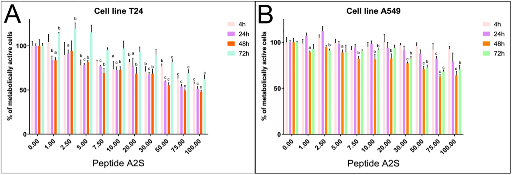 Percentage of metabolically active human bladder cancer cell line T24 (A) and human lung cancer cell line A549 (B) treated by a range of A-2S concentrations (1, 2.5, 5, 7, 10, 20, 30, 50 and 100 µM) 4, 24, 48 and 72 h post-treatment. Each sample was measured in triplicate. Statistically significant difference is expressed at P<0.05 (a), P<0.01 (b) and P<0.001 (c).