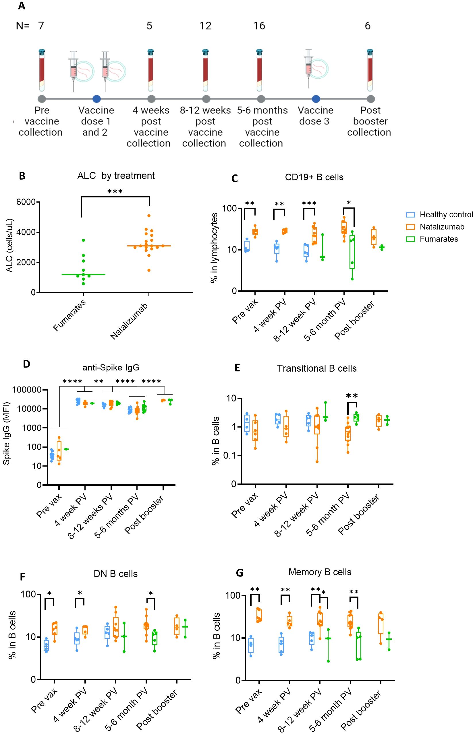 Figure 1. Anti-Spike IgG levels in natalizumab and fumarate-treated pwMS are comparable to healthy controls up to 6 months of SARS-CoV-2 mRNA vaccination. (A) Collection timeline for natalizumab and fumarate-treated pwMS, including post-booster collection timepoint. The pre-vaccine baseline sample was collected before the initial two-dose vaccine series. The number of patient samples at each time point is shown above each time point, the breakdown of each treatment at each time point can be found in methods. (B) Comparison of Absolute Lymphocyte Count (ALC) between fumarate green) and natalizumab (orange) treated pwMS at the pre-vaccine collection timepoint, measured as cells/uL. (C) Comparison of %CD19+ B cells in lymphocytes between healthy control (blue), natalizumab treated pwMS (orange), and fumarate-treated pwMS (green), across all analyzed pre- and post-vaccination collection time points. (D) Anti-Spike IgG levels as determined by MBI assay, displayed as Mean Fluorescence Intensity (MFI), compared between healthy control (blue), natalizumab treated pwMS (orange), and fumarate-treated pwMS (green). (E-G) % Transitional B cells (E), Double Negative (DN) B cells (F), and Memory B cells (G), compared between all collected time points, plotted as the percentage of each B cell subtype in total B cells. Healthy control (blue), natalizumab treated pwMS (orange), and fumarate treated pwMS (green) are shown. Mann-Whitney test was used for statistical comparisons in all panels except (D), where a 2-way ANOVA with Benjamini, Krieger and Yekutieli two-stage step up method to control for False Discovery Rate was used p<0.05 (*), p<0.01 (**), p<0.001 (***), and p<0.0001 (****).