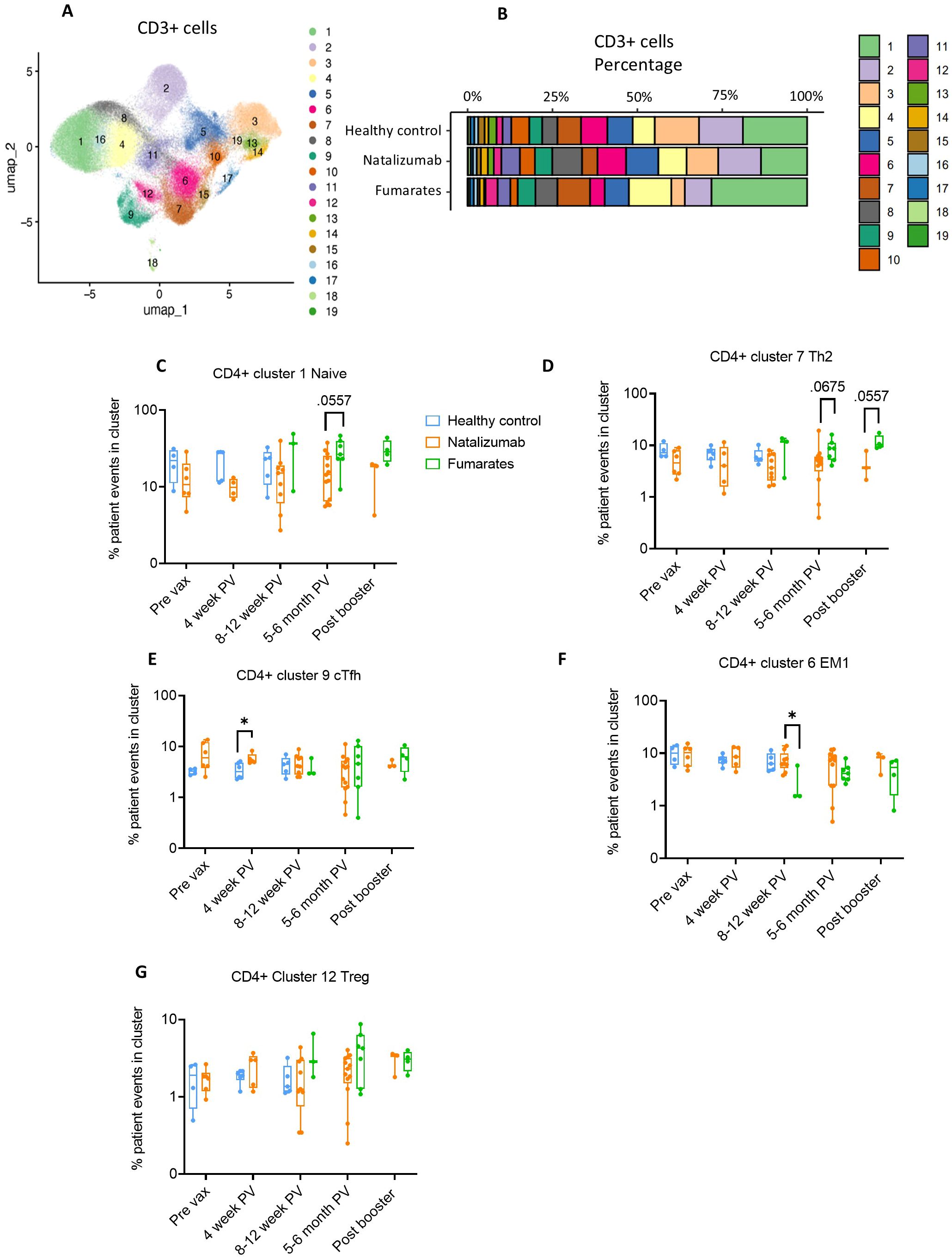 Figure 3. Fumarate treatment results in a shift towards an anti-inflammatory CD4+ T cell composition when compared to natalizumab treatment in pwMS. (A) UMAP depicting all CD3+ T cells collected from all pre- and post-vaccine collection time points, including both fumarate and natalizumab-treated pwMS for phenotyping purposes. 19 clusters were identified for further analysis. (B) The proportion of each identified CD3+ T cell cluster compared between healthy controls, natalizumab treated pwMS, and fumarate treated pwMS. (C–G) Longitudinal comparison of phenotyped UMAP clusters showing naïve T cells (C), Th2 T cells (D), CXCR5+ circulating T follicular helper (cTfh) T cells (E), effector memory 1 (EM1) T cells (F), and T regulatory T cells (G) between healthy control (blue), natalizumab treated pwMS (orange) and fumarate treated pwMS (green). Each dot represents a single patient, plotted as the percentage of events in a particular cluster out of the total number of events collected for that patient. Mann-Whitney test was used for statistical comparisons. P<0.05 (*).
