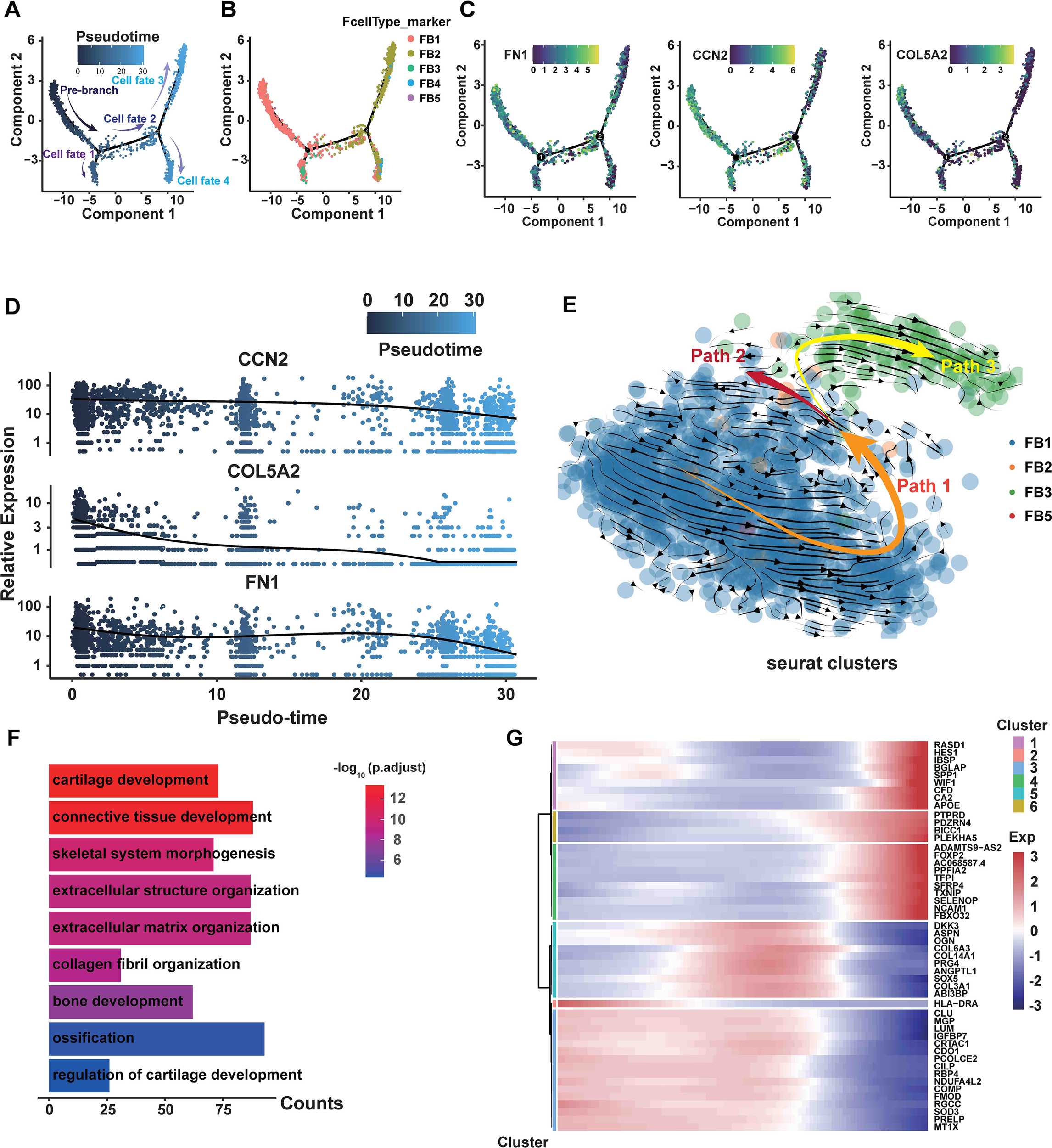 Subsequently, we performed RNA velocity study on HLF fibroblasts to predict the potential direction as well as the rate of cellular state transitions. This study outlined three categories of vectors, referred to as paths. Additional analysis indicated that the paths displayed a branched trajectory with two main branches, Path2 and Path3, and a ‘pre-branch’ Path1, representing the initial phases of fibroblasts (Figure 5E). FB1 comprised the predominant portion of the pre-branch, while FB3 constituted the majority of Path3 (Figure 5E). Furthermore, GO analyses revealed that cartilage development, bone development, ossification, extracellular matrix organization and collagen fibril organization were more enriched in FB1 than in other fibroblast subpopulations (Figure 5F). Heatmaps of pseudo-temporal gene expression revealed that gene expression patterns changed at different stages of fibroblast differentiation (Figure 5G). In summary, these results demonstrate that FB1 might show lower differentiation compared to other fibroblast subpopulations, and the trajectory of fibroblasts displays a significant shift from the FB1 to the FB3 phenotype.