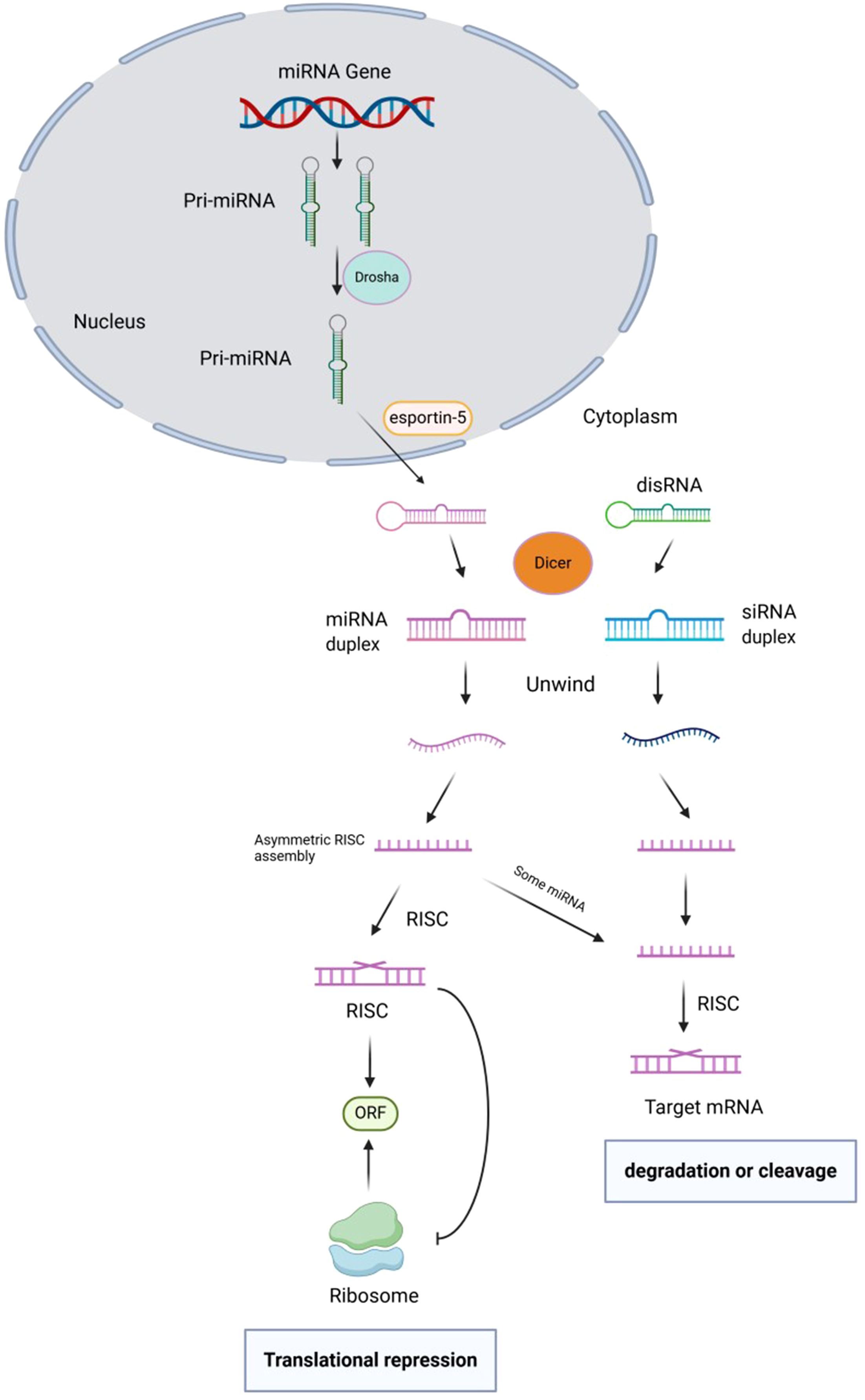 In fruit flies, nematodes, and mammals, Dicer plays a crucial role in the processing of long dsRNA into mature miRNAs. This process is akin to the production of double-stranded RNAs in RNA interference. Initially, exportin-5 transports pre-miRNA into the cytoplasm, where it is released due to the low concentration of RanGTP. Dicer then recognizes the double-stranded region of the pre-miRNA, which is phosphorylated at the 5’ end of the stem-loop base and exhibits a distinctive structure at the 3’ end. Dicer unwinds the two helices at the base of the stem-loop and cleaves both strands, resulting in the production of a 22nt-long, 5’-phosphorylated, siRNA-like, partially paired double-stranded RNA known as miRNA. This RNA duplex consists of mature miRNA and its complementary strand. Although Dicer can generate RNA double-stranded intermediates during pre-miRNA processing, these intermediates typically have a short lifespan and are challenging to detect (30).
