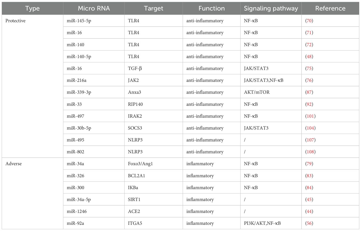 Lung inflammation is a significant contributor to acute lung injury (ALI). An imbalance between inflammatory and anti-inflammatory responses exacerbates the development of ALI/ARDS. In human lung epithelial cells, miR-454 was found to inhibit CXCL12 mRNA translation by targeting its 3’-UTR. The expression of miR-454 suppresses the production of inflammatory cytokines and enhances the integrity of the alveolar epithelial barrier (46). LPS-induced acute lung injury (ALI) was identified by elevated levels of the proinflammatory cytokines IL-6 and miR-181b. Previous studies have shown that miRNA-181b regulates the expression of p65 protein via a specific signaling pathway, thus playing a crucial role in the development of ALI (47). miR-140-5p has been shown to increase the expression of toll-like receptor 4 (TLR4) and MyD88 protein in human lung A549 cells, along with the activation of nf-kappa B. Up-regulation of miR-140-5p has been found to inhibit the inflammatory response in an acute lung injury (ALI) model by reducing the activation of the TLR4/MyD88/NF-κB signaling pathway (48). In ALI/ARDS induced by viral and bacterial lung infection, there was a significant increase in the expression of miRNA-200c-3p, along with a decrease in the expression of ACE2 protein. The overexpression of miR-200c-3p, dependent on Nf-κb, led to a reduction in ACE2 levels, subsequently increasing angiotensin II levels and resulting in lung injury (49). Some miRNAs (e.g., miR-140-5p, miR-200c-3p) not only suppress NF-κB signaling but are also transcriptionally induced by NF-κB, creating dynamic feedback loops that amplify or resolve inflammation. Also, miRNA-mediated signaling pathways exerted their roles by integrating mitochondrial cross-talk and regulating production of inflammasomes. miRNA-466 family molecules are secreted by the airway epithelium and regulate inflammatory responses through the NLRP3 inflammasome pathway (50). The inactivation of the Nlrp3 inflammatory corpuscle, mediated by vesicle delivery of micrornas, particularly miR-223 and miR-142, inhibits macrophage activation and lung inflammation (8). Yan et al. discovered that miR-155 is expressed in bone marrow-derived lymphocytes and is freely expressed in lymphatic lung parenchymal cells. They found that miR-155–2 promotes acute lung injury (ALI) induced by LPS through the Tie-2 channel in lung parenchymal lymphocytes (51). MiR-223 plays a crucial role in acute lung injury (ALI) induced by damage-associated molecular patterns (DAMPs). Specifically, miR-223 downregulates NLRP3 expression and inhibits IL-1β release, leading to a decrease in Ly6G+ neutrophils. This ultimately mitigates ALI caused by mitochondrial DAMPs (52). Studies have also indicated that miRNAs regulate inflammation through various pathways. For instance, research conducted by Yin et al. demonstrated that miR-34/449 suppresses inflammation by targeting IGFBP-3, consequently inhibiting autophagy (53).