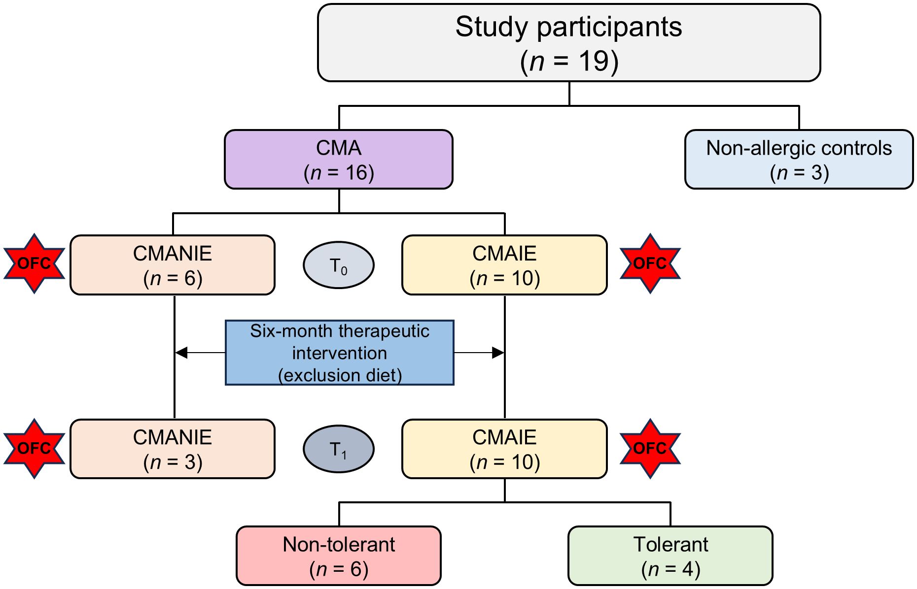 Figure 1. Flowchart of patient classification. Nineteen participants were recruited for the study: 3 non-allergic controls and 16 children allergic to cow’s milk protein. These patients included 6 CMANIE children and 10 CMAIE individuals at baseline (T0). An exclusion diet was implemented for six months, and after treatment (T1), the number of CMAIE participants remained the same. However, only 3 patients were recovered from the CMANIE group. In the CMAIE group, after treatment, 6 patients were non-tolerant and 4 were tolerant, as shown by the OFC results.