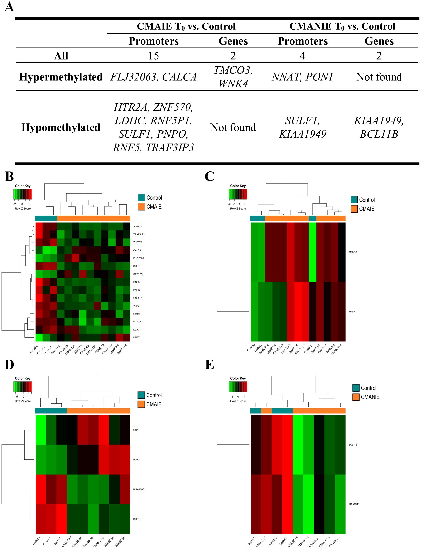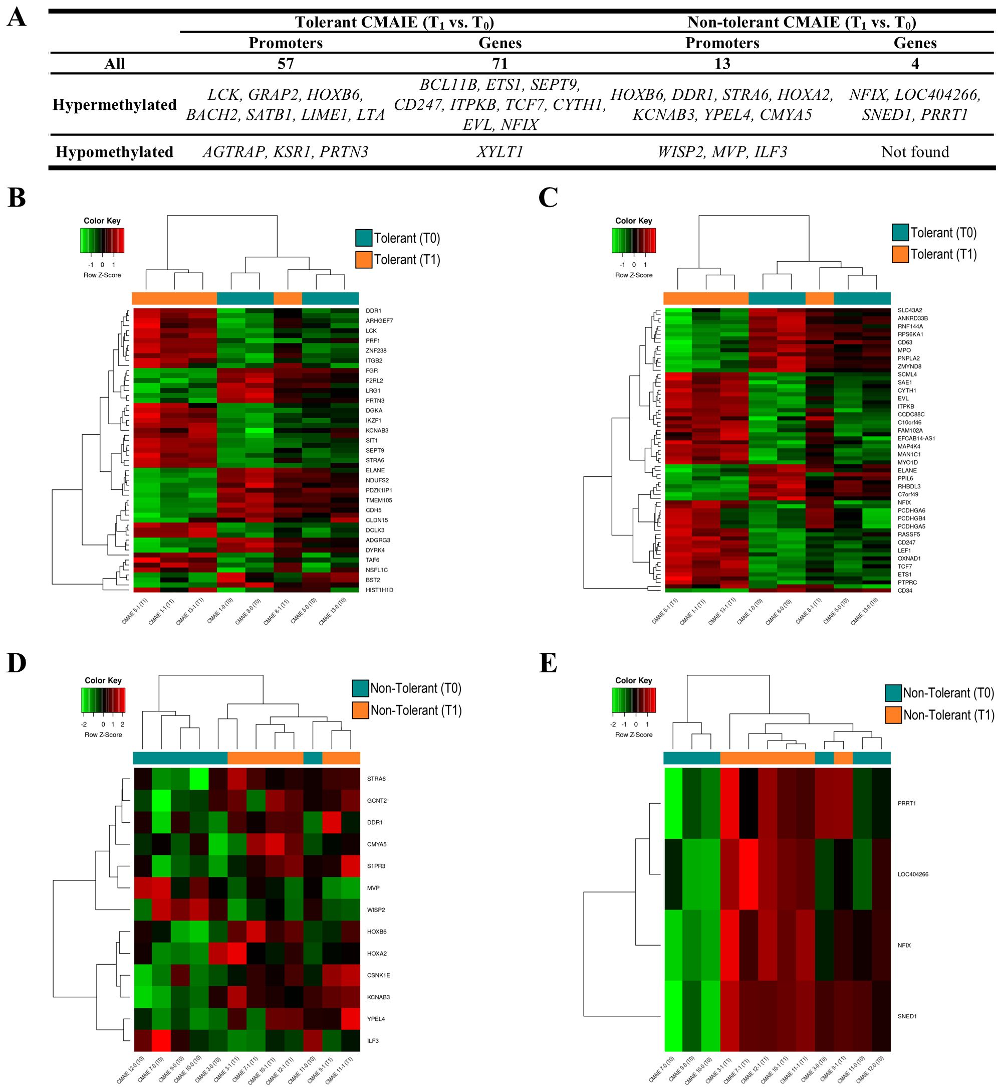 Figure 5. Tolerant children exhibit greater methylation profile changes compared to non-tolerant children after treatment. (A) Top 10 most significant DMRs identified in promoters and genes during the longitudinal comparison of tolerant and non-tolerant CMAIE patients before (T0) and after (T1) treatment. A total of 57 promoter-associated and 71 gene-associated DMRs were detected in tolerant patients, while only 13 and 4 were found in the non-tolerant group. (B, C) Heatmaps based on methylation of DMRs in promoters (B) and genes from tolerant patients. The methylation profiles largely distinguish samples by time point, with the exception of sample CMAIE 8-1. (D, E) Heatmaps of significant DMRs found in promoters (D) and genes (E) in the non-tolerant subgroup show limited differential methylation across time points. Z-scores derived from beta methylation values are represented, where green indicates hypomethylation and red indicates hypermethylation. CMAIE: CMAIE patients.