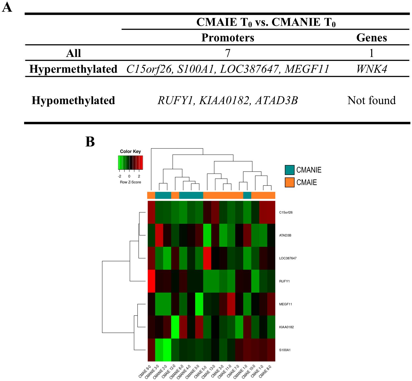 On the other hand, we compared CMAIE and CMANIE groups at baseline, identifying a total of 7 significant DMRs annotated to promoters (4 hypermethylated and 3 hypomethylated in CMAIE group) and 1 hypermethylated to genes have been identified (Figure 3A; Supplementary Table S3). The heatmap performed with significant DMRs in promoters shows a relatively good separation of the samples into their respective groups, although several samples do not cluster correctly (Figure 3B).