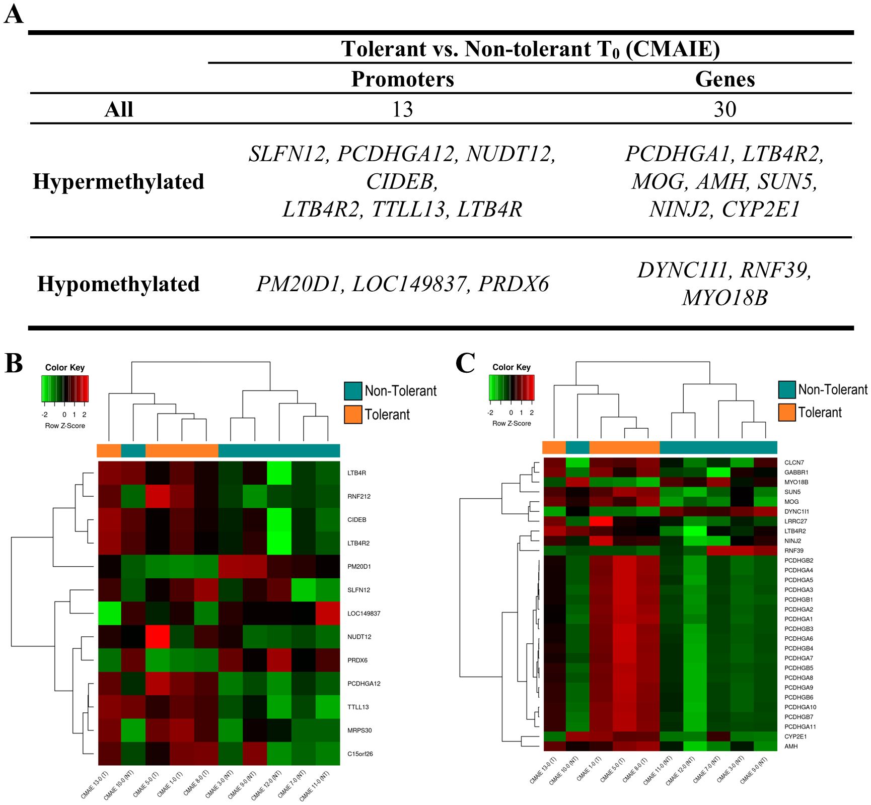 Figure 4. Differential DNA methylation distinguishes tolerant and non-tolerant CMAIE infants at baseline. (A) Top 10 most significant DMRs identified through mCSEA analysis, annotated to promoter regions and gene. More gene-associated DMRs were observed than promoter-associated DMRs. (B, C) Heatmaps based on average methylation values of CpG probes within significant promoter-associated (B) and gene-associated (C) DMRs. The methylation profiles demonstrate clear separation between tolerant and non-tolerant CMAIE infants, with only one non-tolerant subject (CMAIE 10-0) clustering with the tolerant group. Z-scores derived from beta methylation values are represented, where green indicates hypomethylation and red indicates hypermethylation. CMAIE: CMAIE patients.