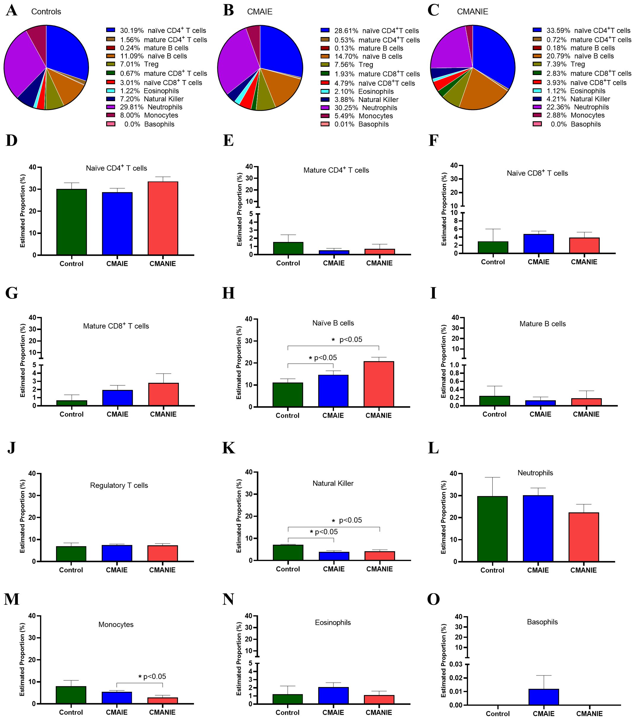 Figure 6. In silico estimation of immune cell composition linked to DMRs. Pie charts (A-C) and bar graphs (D–O) illustrate the average proportions of 12 immune cell types, including naïve CD4+ T cells (D), mature CD4+ T cells (E), naïve CD8+ T cells (F), mature CD8+ T cells (G), naïve B cells (H), mature B cells (I), regulatory T cells (J), natural killer (K), neutrophils (L), monocytes (M), eosinophils (N) and basophils (O) across the control, CMAIE, and CMANIE groups. No significant differences were observed in most immune cell populations, except for naïve B cells (H), natural killer (K) and monocytes (M). These findings suggest potential systemic immune involvement in CMA. Bars represent the mean ± SEM. Kruskal-Wallis test with Dunn’s post hoc test was employed to compare multiple groups,* indicate p<0.05.