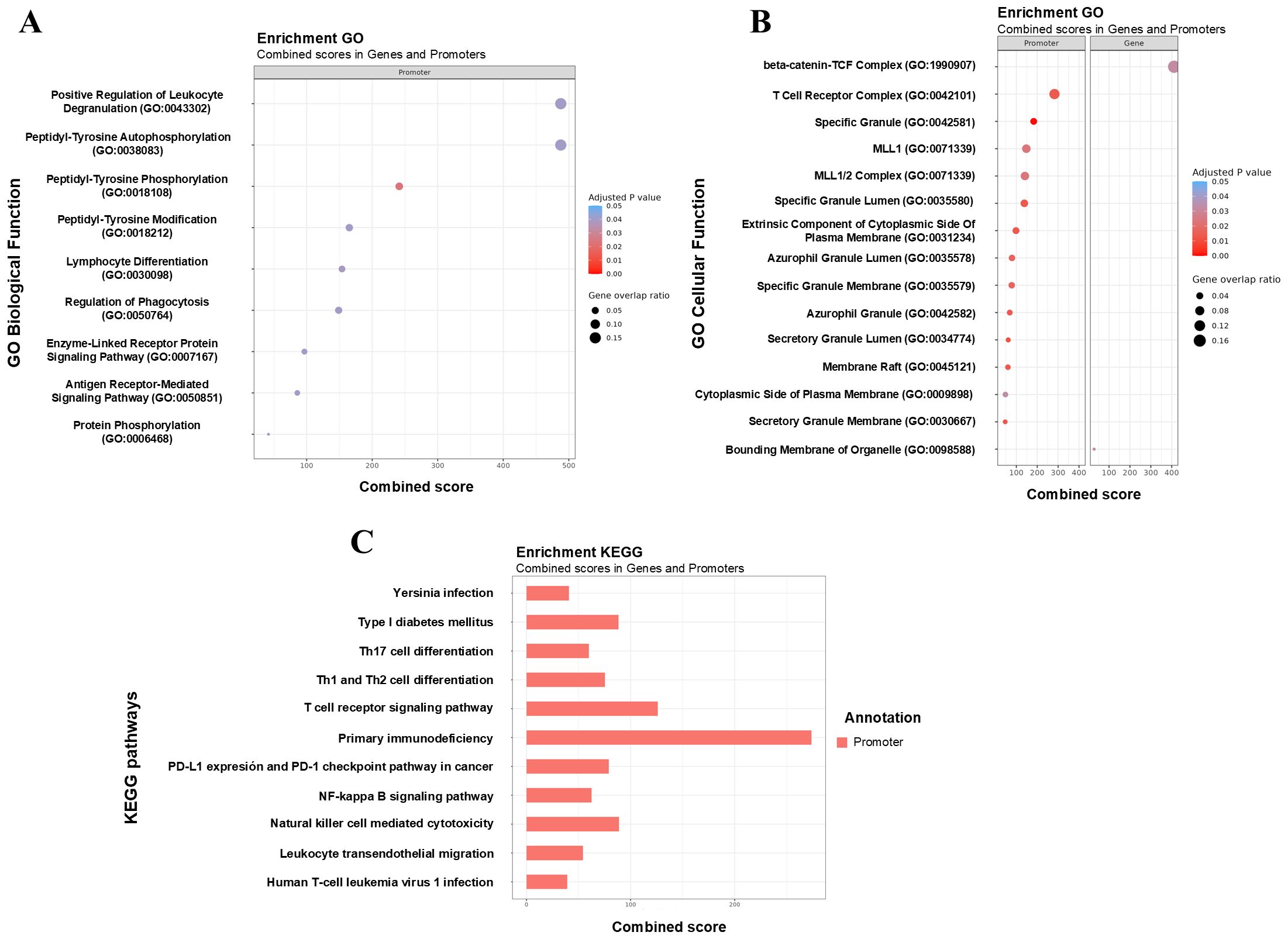Figure 7. Functional enrichment of DMRs highlights key immune-related pathways associated with tolerance acquisition. (A, B) Gene Ontology (GO) enrichment analysis of differentially methylated promoters and gene identified in tolerant CMAIE patients before (T0) and after (T1) treatment. Significant enrichment was observed in biological processes linked to immune cell function, including positive regulation of leukocyte degranulation, lymphocyte differentiation, regulation of phagocytosis, and pathways related to the T cell receptor complex and secretory granule function. The combined score of enrichment, the adjusted p-value, and the gene overlap ratio are displayed. The gene overlap ratio is calculated by dividing the number of significant genes identified in the mCSEA analysis by the total number of genes associated with the respective GO term. (C) Barchart of KEGG terms combining scores of genes and promoters based on differential methylations found in tolerant CMAIE patients at baseline and after exclusion diet. KEGG pathway enrichment revealed additional immune and allergy-relevant pathways, such as Th1, Th2, and Th17 cell differentiation, T cell receptor signaling, and the NF-κB signaling pathway. .